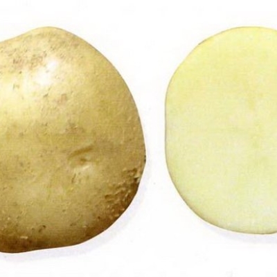 Что касается клубней, то они округлые с тупой вершиной и плоским столонным следом, кремового цвета. Кожура сетчатая и шелушащаяся; глазки мелкие и многочисленные. Мякоть клубня белая, без потемнения при резке, а масса товарного клубня варьируется от 48 до 140 граммов.