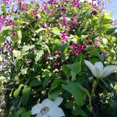 Комментарий: Растет вместе с крупноцветковым белым клематисом на арке. Супер!