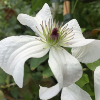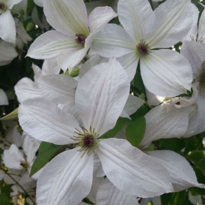 Цветки этого клематиса мелкоцветковые, диаметром от 6 до 9 см. Лепестки окрашены в белый цвет с легким фиолетово-розовым оттенком. Они шириной 3 см и длиной 4,5 см, кончики заостренные. Количество чашелистиков составляет от 4 до 6 штук.