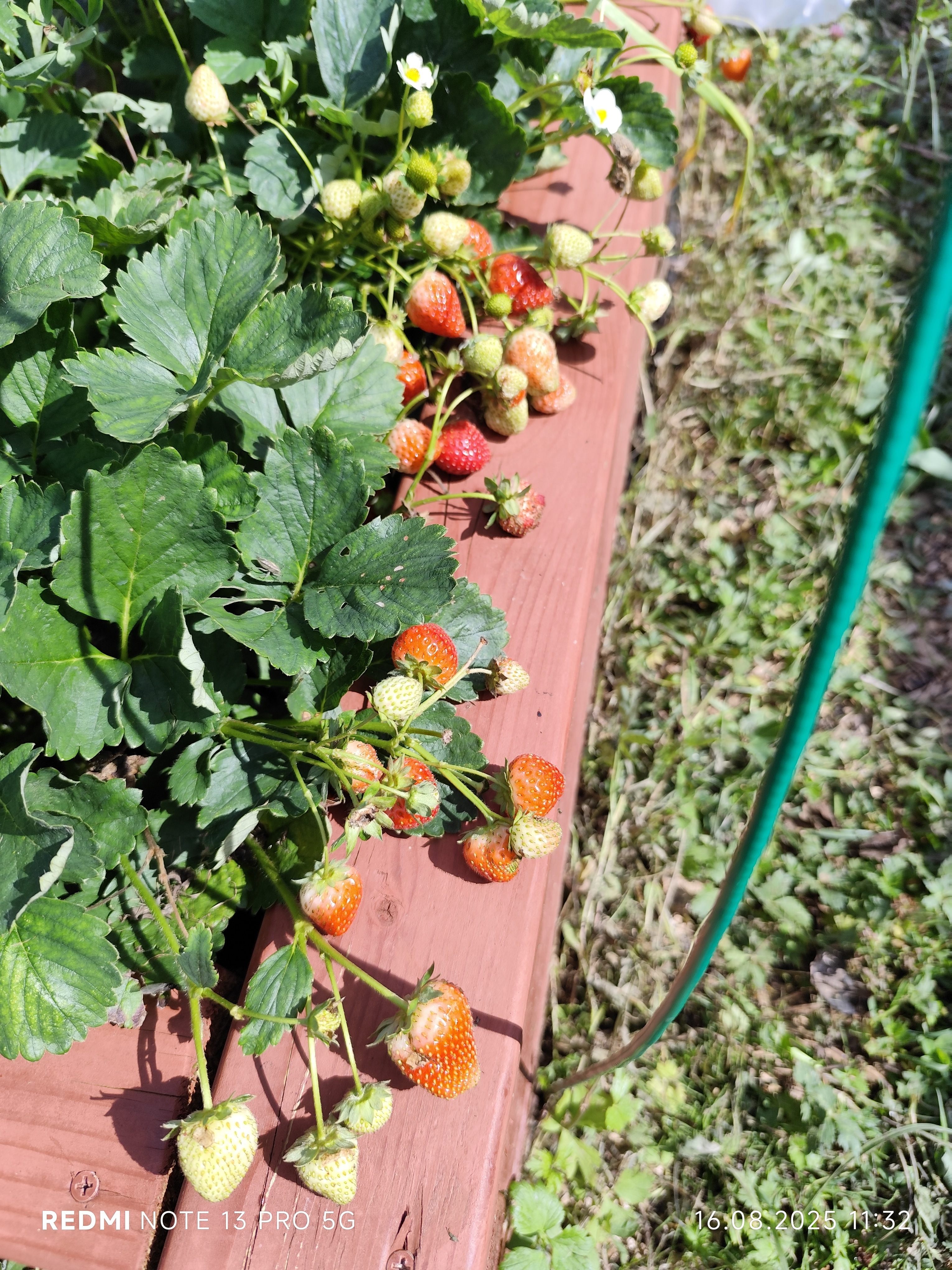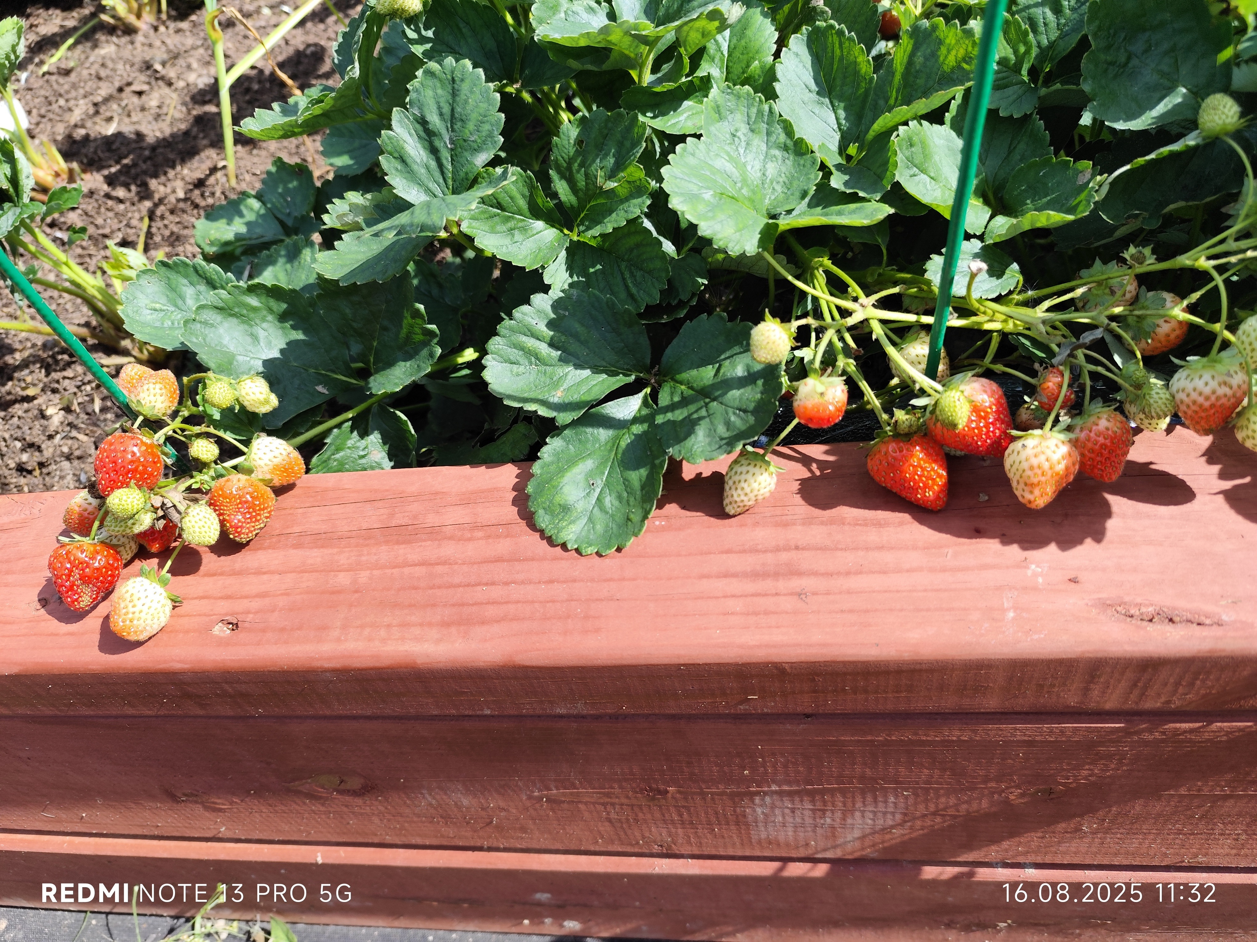 Преимущества: Заплодонисила в первый год посадки, сладкая, даже если ещё недоспела. Много усов даёт до плодоношения, потом перестает, срезала все, если не досмотреть, тут же укореняется. Обязательно буду размножать. Начало октября, а она продолжает выпускать цветоносы. Срезаю. За лето из маленьких саженцев превратилась в густые кусты