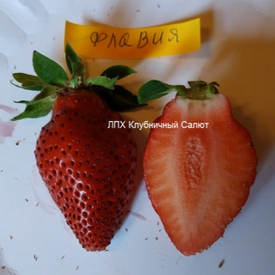 Ягоды сорта Флавия имеют ярко-красный цвет и ширококоническую форму. Они обладают средним размером и массой 30-35 г (до 40 г). Вкус ягод сладкий, практически без кислинки, а их мякоть сочная и без пустот. Сорт Флавия обладает преимуществами, такими как стойкость к деформации при хранении, и хорошая транспортабельность плодов.