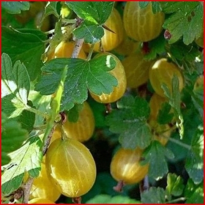 Сортовой желтоплодный крыжовник – это сильнорослый и компактный кустарник, который в благоприятных климатических условиях вырастает до 150 см. Характеризуется растение слабораскидистыми ветвями, прямостоячими темно-серыми побегами, развитой корневой системой, умеренной загущенностью и темно-зелеными листьями, которые к осени меняют окрас на буро-фиолетовый. Ошипованность у куста слабая – одиночные и мягкие колючки равномерно распределены по всей длине побегов. В период цветения кустарник густо покрывается некрупными желтовато-белыми цветочками. Цветет крыжовник в последнюю декаду мая – на протяжении 5-7 дней.