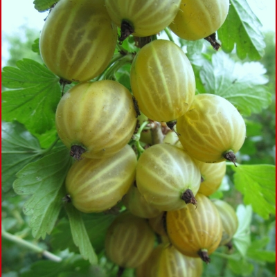 Английский желтый относится к крупноплодным видам. При правильном уходе на кустах вырастают ягоды массой от 4-х до 5 граммов. Форма у плодов правильная – овальная с гладкой поверхностью, где заметна слабая опушка и выраженный блеск. Спелый крыжовник имеет необычный экзотический окрас – ярко-желтый, иногда насыщенно-янтарный с четким жилкованием. Кожица у плодов умеренной плотности, ближе к тонкой, но прочная и без жесткости. Благодаря эластичности кожуры ягодки не растрескиваются.