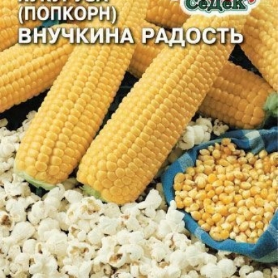 Растение кукурузы Внучкина радость достигает высоты около 160 см. Оно имеет крепкий стебель с хорошей устойчивостью к заболеваниям и вредителям. Початки этого сорта короткие — длиной от 10 до 12 см, массой от 220 до 280 г. Зерна имеют мелкий размер и ярко-оранжевый цвет, что придает им привлекательный вид.