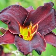 • Окраска цветка: темная вишнево-красная, темно-бордовая с ярко-желтым или желто-зеленым горлом и тонкой желтой продольной полосой
