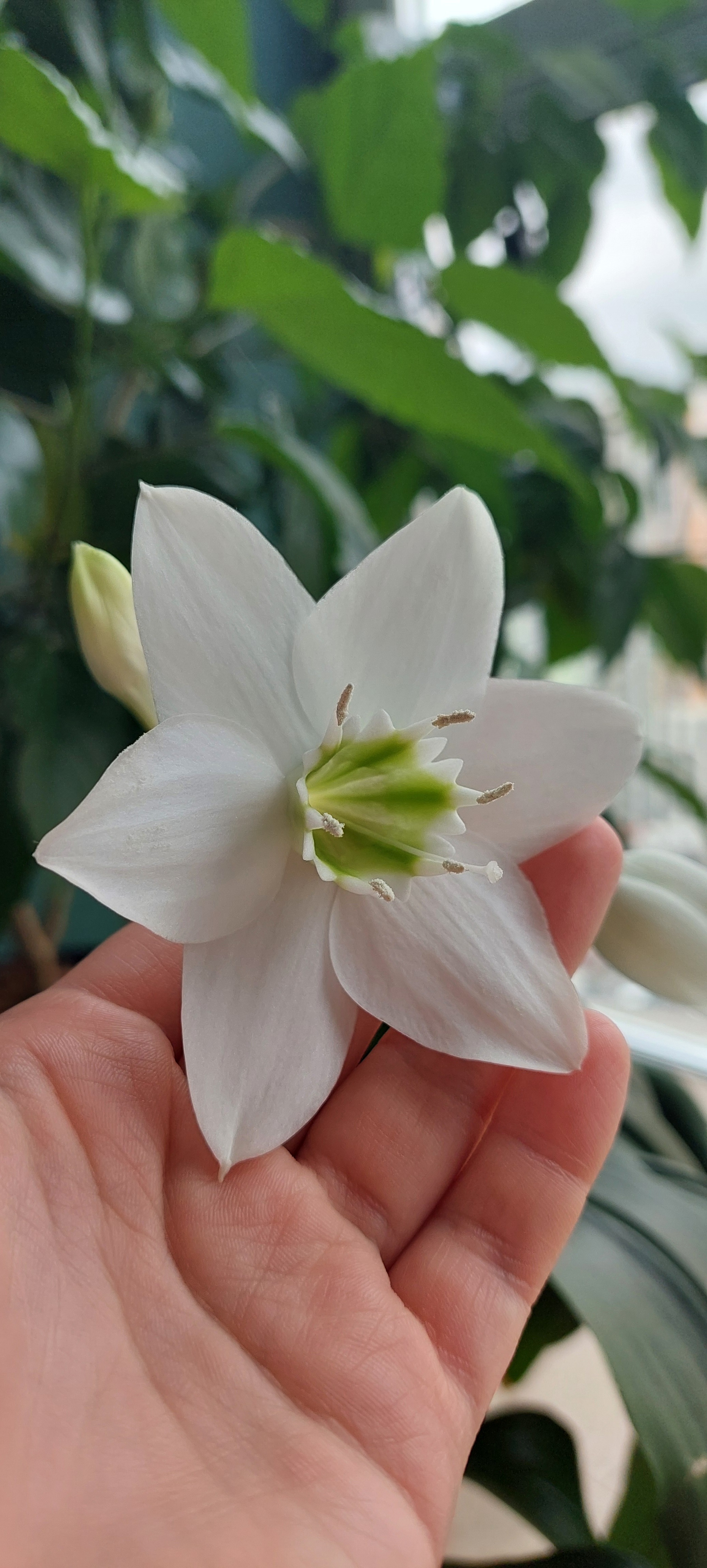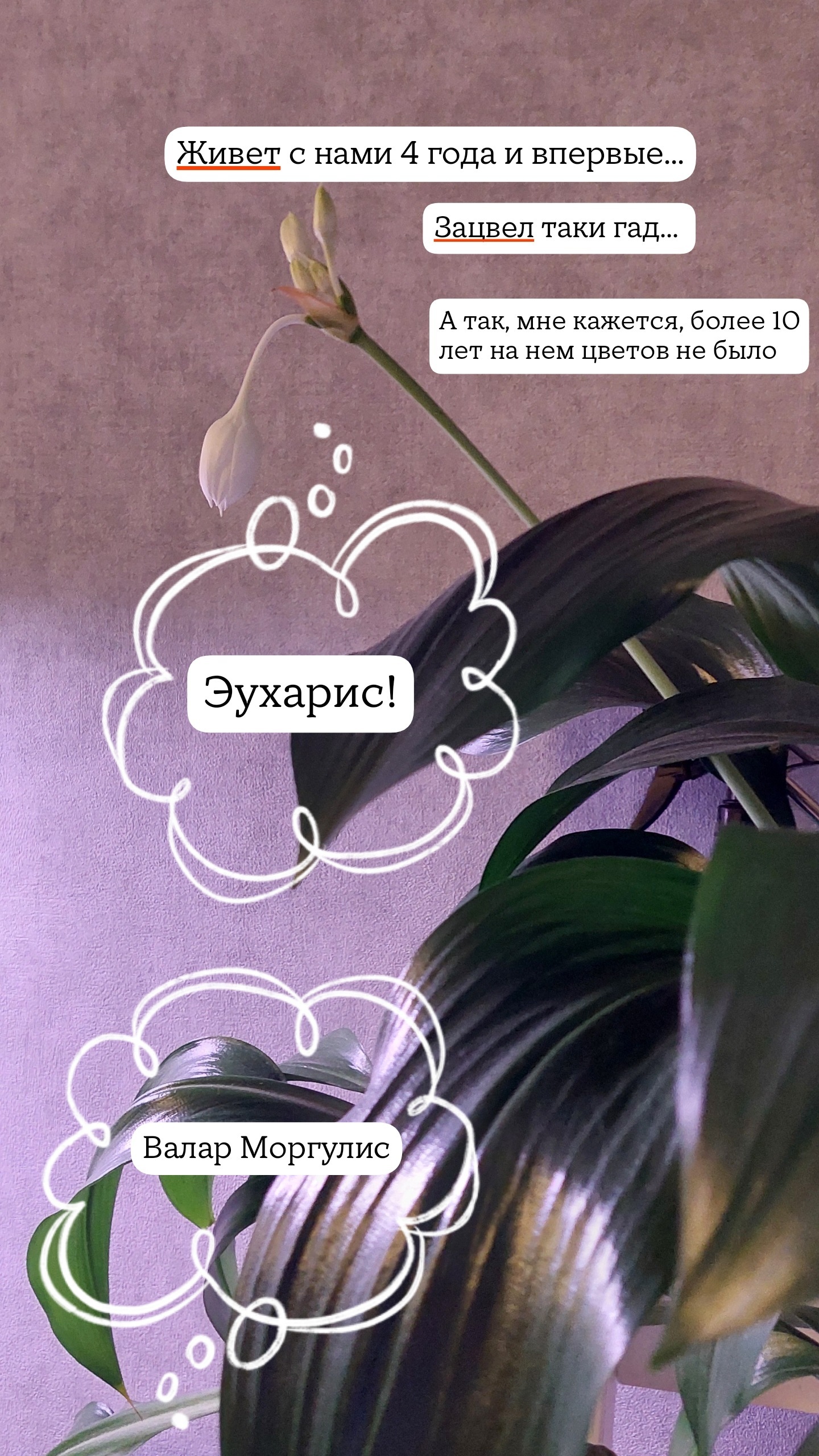 Комментарий: Расскажу о своем "дуралее" Эухарисе. Достался мне этот цветок около 4-5 лет назад. Переехал ко мне жить от свекрови, к слову у нее он жил примерно 10 лет и цвел всего 1 или 2 раза. Она переезжала и девать его было не куда, поэтому переехал он ко мне. Дважды я его пересаживала и он у меня не цвел зараза, но хоть своей пышной листвой меня радовал. И как-то раз решила я его подкормить обычной Агриколой, которая подходит для питания рассады. И нежданно негаданно он решил зацвести, моей радости не было предела. Впервые за очень долгий промежуток времени он решился таки. В итоге он у меня цвел в ноябре 2024 года и второй раз в марте 2025. Обрадовал так обрадовал. Не знаю, будет ли опять цветонос выпускать под зиму или нет, но чуда жду. Он действительно приятно пахнет, и цветочки нежные красивые... Я долго не знала как именно этот цветок называется, этот сайт помог мне его определить.