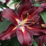 • Окраска цветка: темно-бордовый с крапинками, по центру каждого лепестка проходит ярко-алая прожилка, серединка желто-зеленая