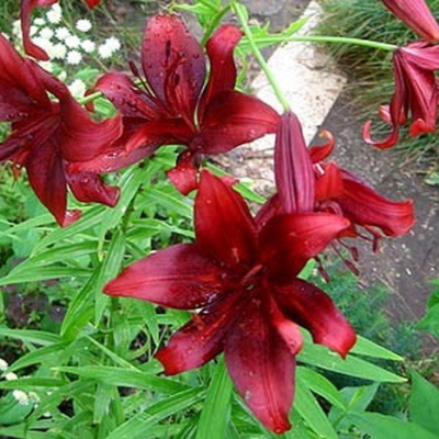 Соцветие лилии Полина представляет собой плотную кисть, состоящую из 12 цветков. Каждый цветок имеет плоско-чашевидную форму и диаметр около 14 см. Окраска цветка вишнево-красная с более светлым центром и мелкими крапинками, что делает его особенно эффектным на фоне зелени. Цветение начинается в конце июня и продолжается в течение 20-22 дней.