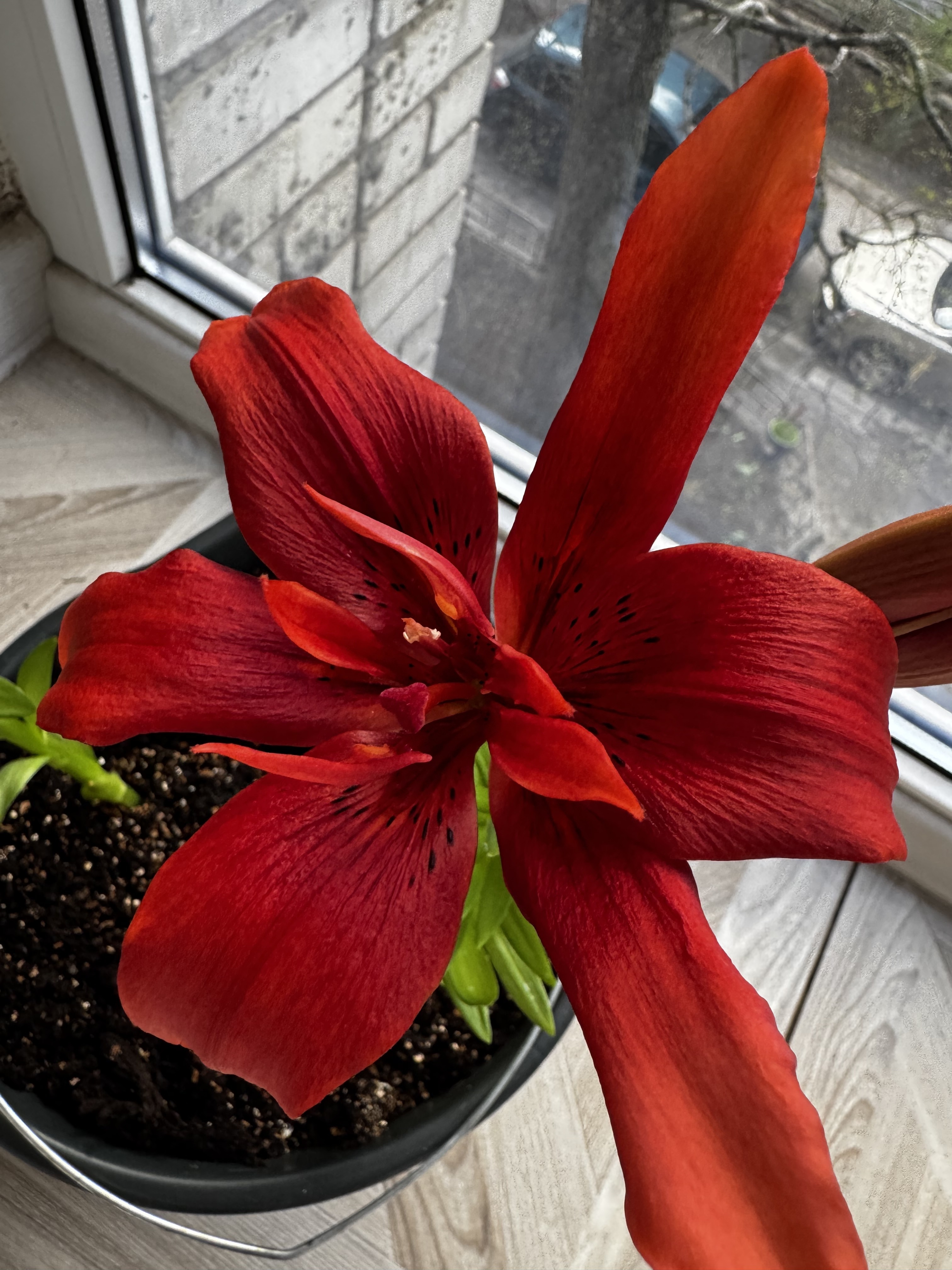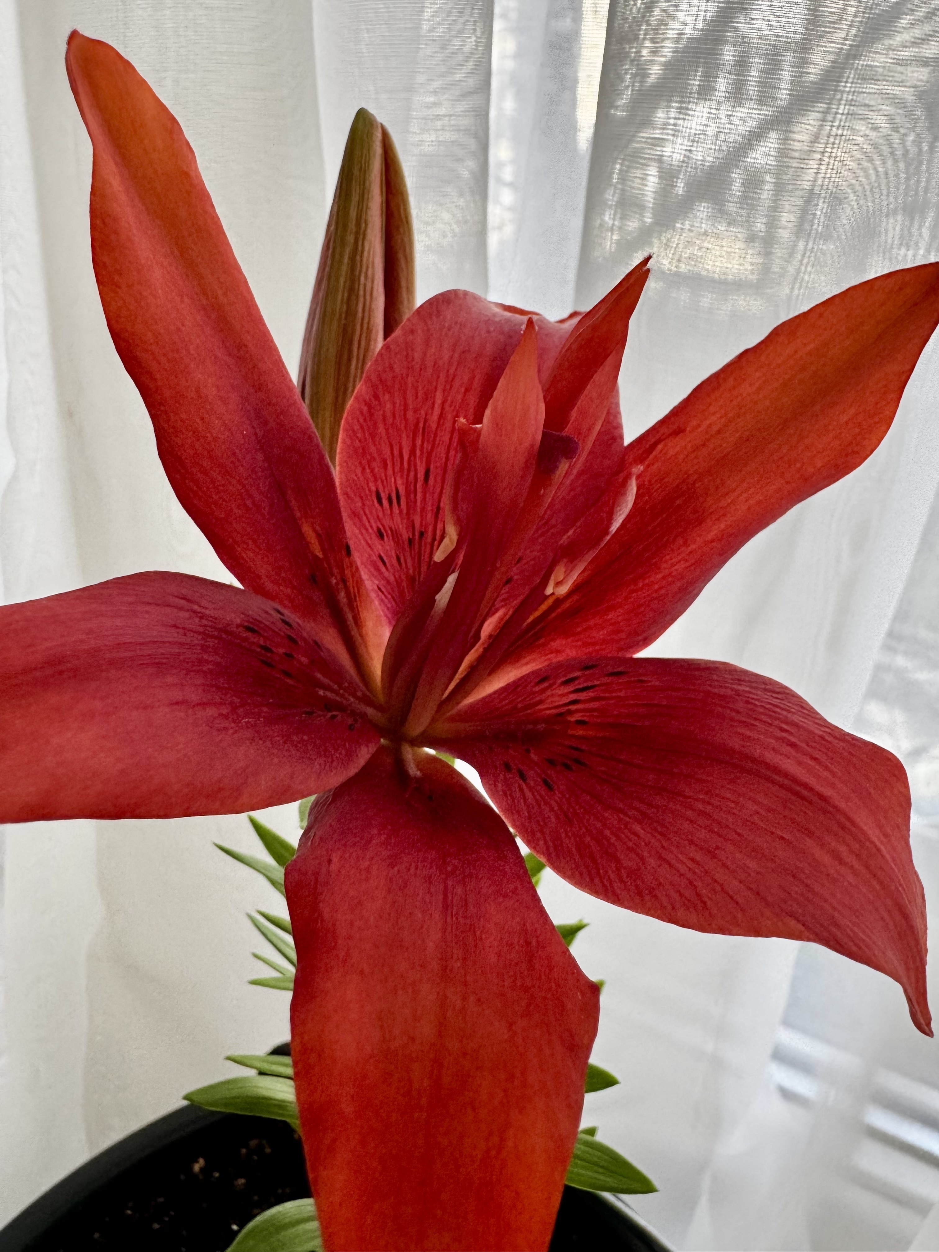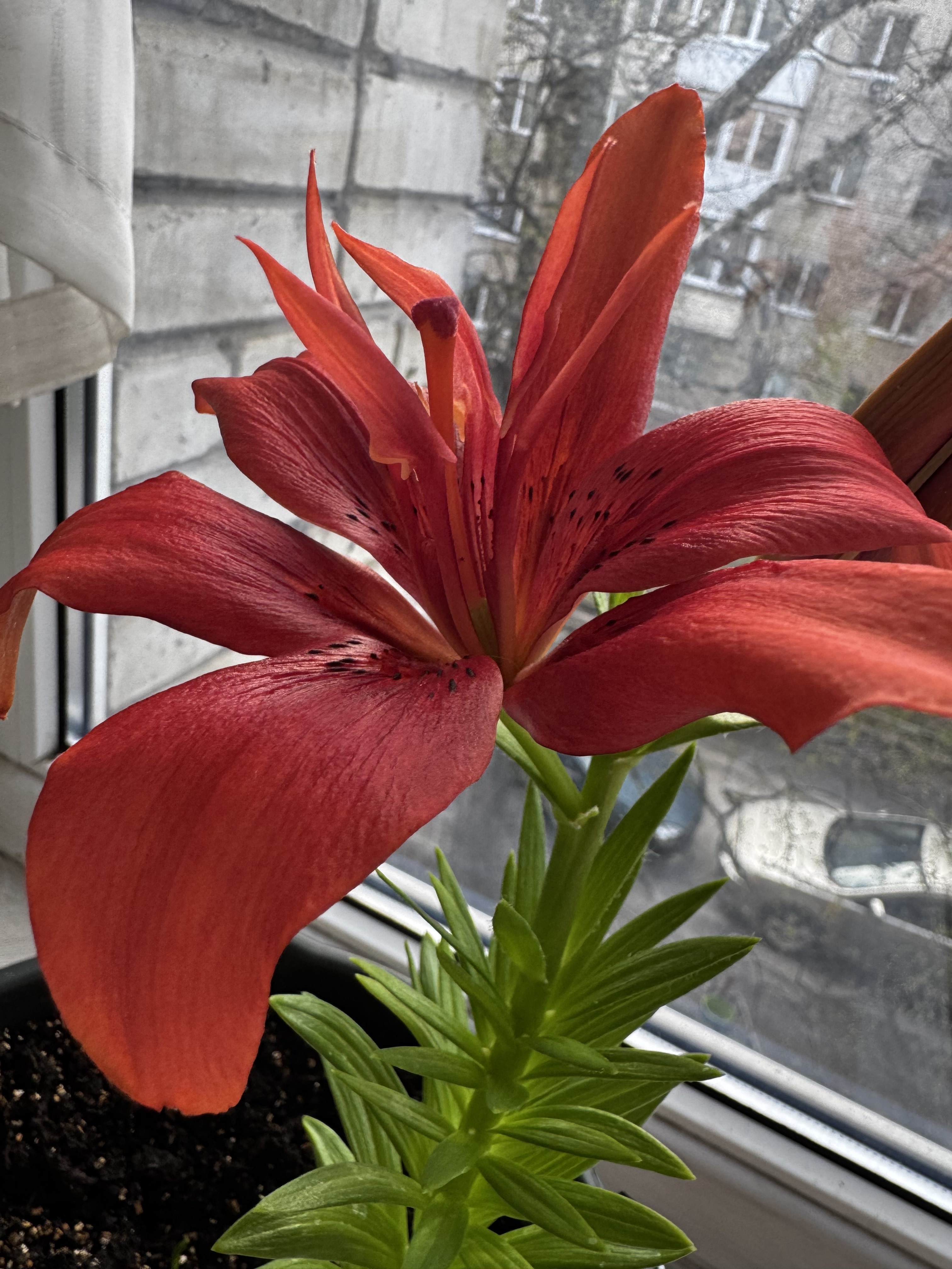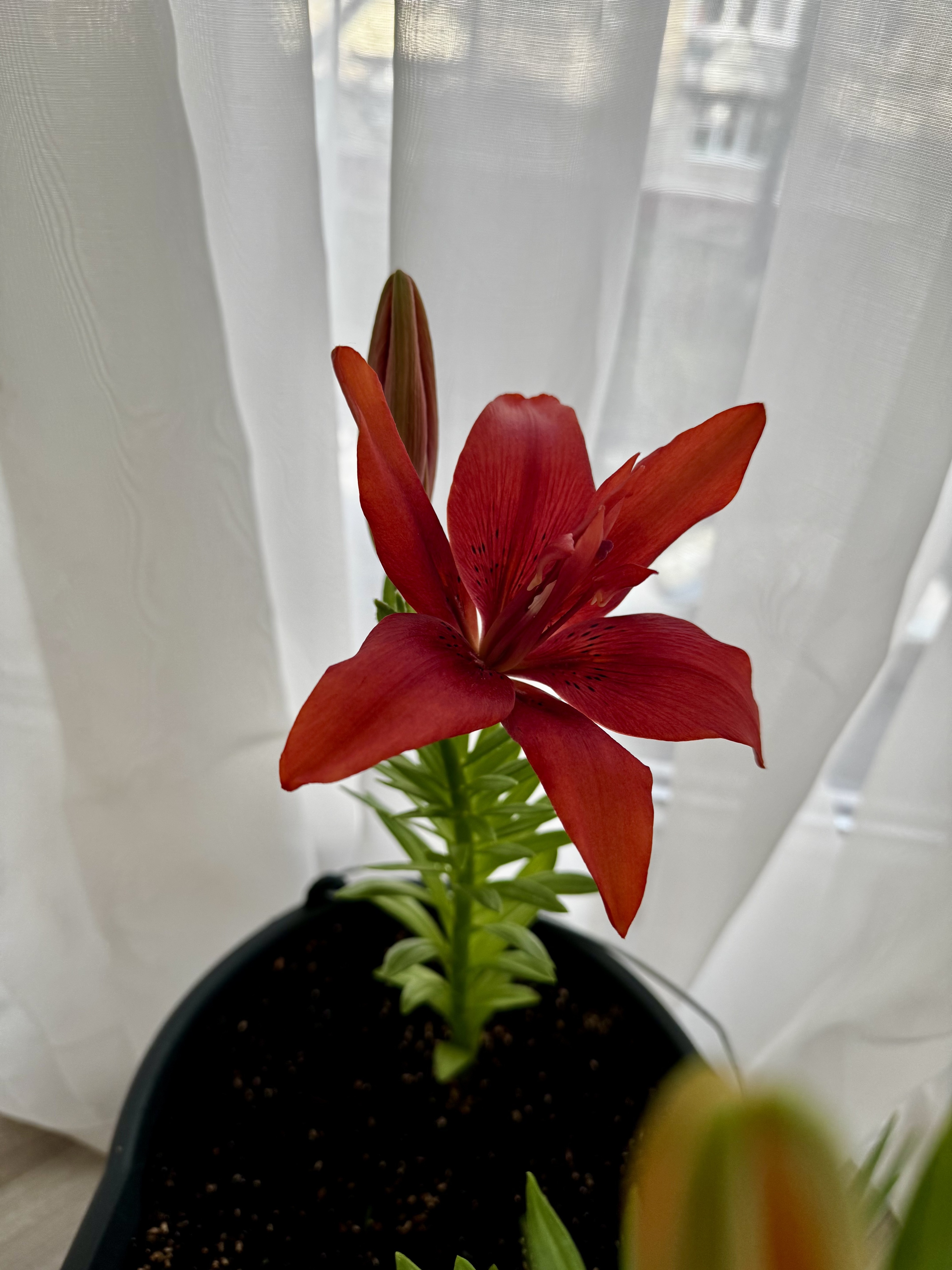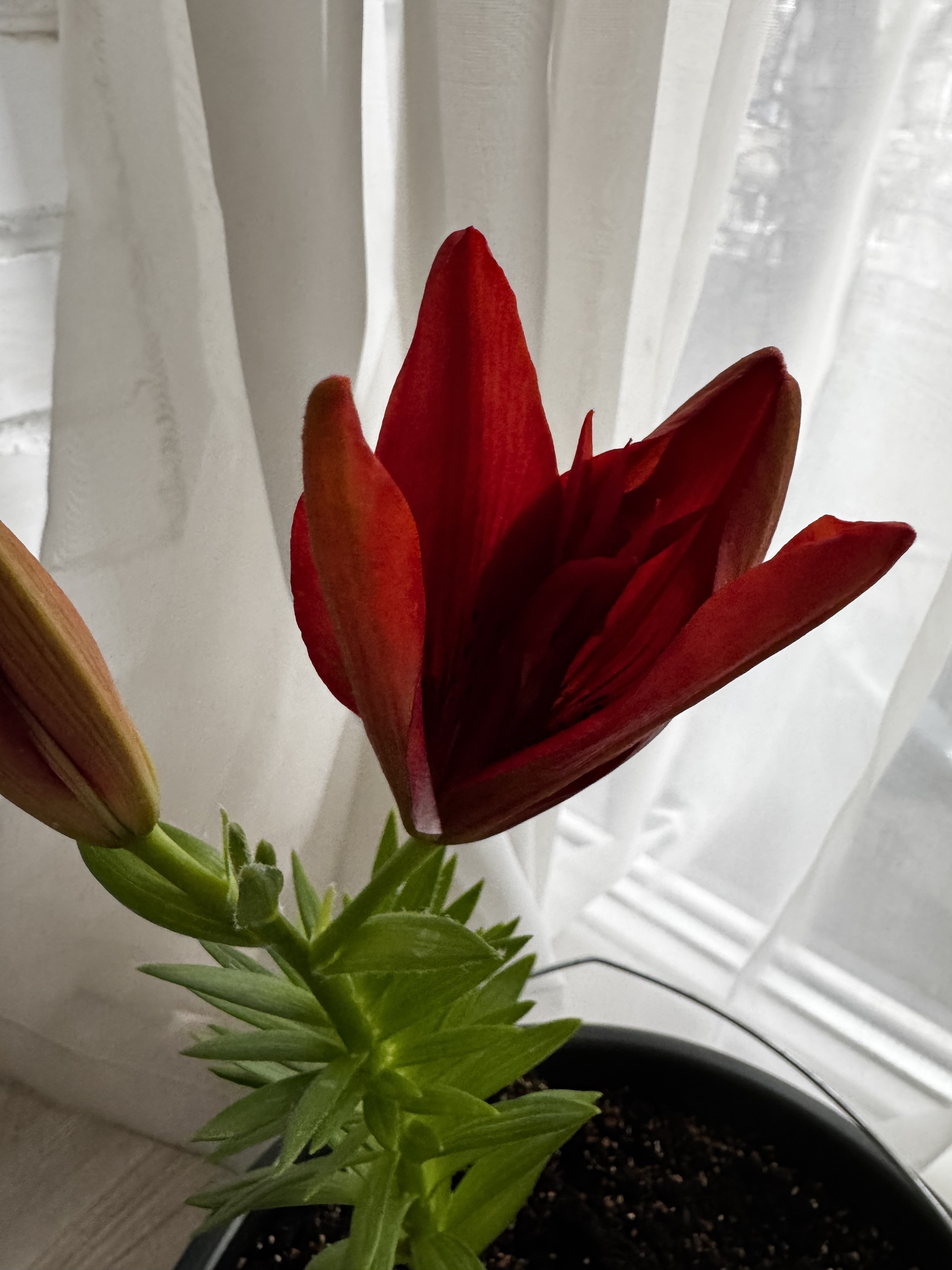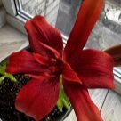 Комментарий: Покупала в марте, луковица была уже с ростком. Точнее с двумя. Привезла домой, посадила в горшок с грунтом 12 марта. Первый бутон распустился ровно через месяц-12 апреля. Второй бутон распустился через 2 дня после первого. Опыта с лилиями не было, это моя первая)
