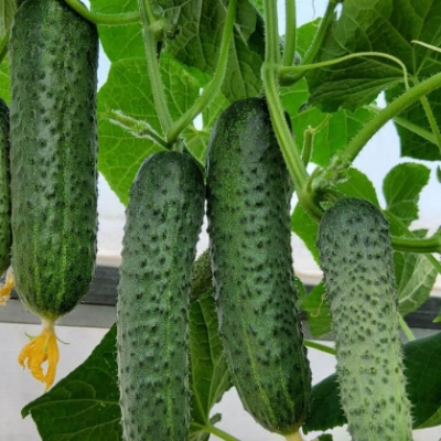 Плоды имеют цилиндрическую форму длиной 12-14 см и массу 100-120 г. Они темно-зеленого цвета без белого кончика, а их поверхность среднебугорчатая. Такой внешний вид делает огурцы привлекательными для потребителей.