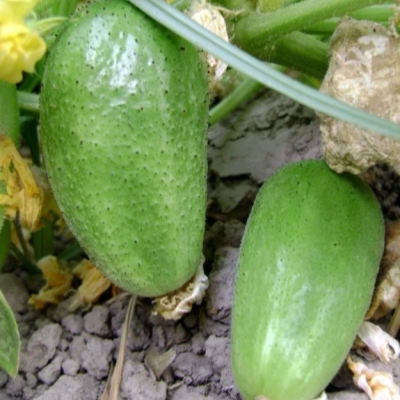 Зеленцы этого сорта имеют удлинённо-яйцевидную форму длиной от 10 до 12 см и массой от 100 до 120 г. Их поверхность среднебугорчатая с характерными черными шипами, которые придают плодам привлекательный вид. Окраска зеленцов ярко-зелёная, что свидетельствует о высоком содержании хлорофилла и других полезных веществ.
