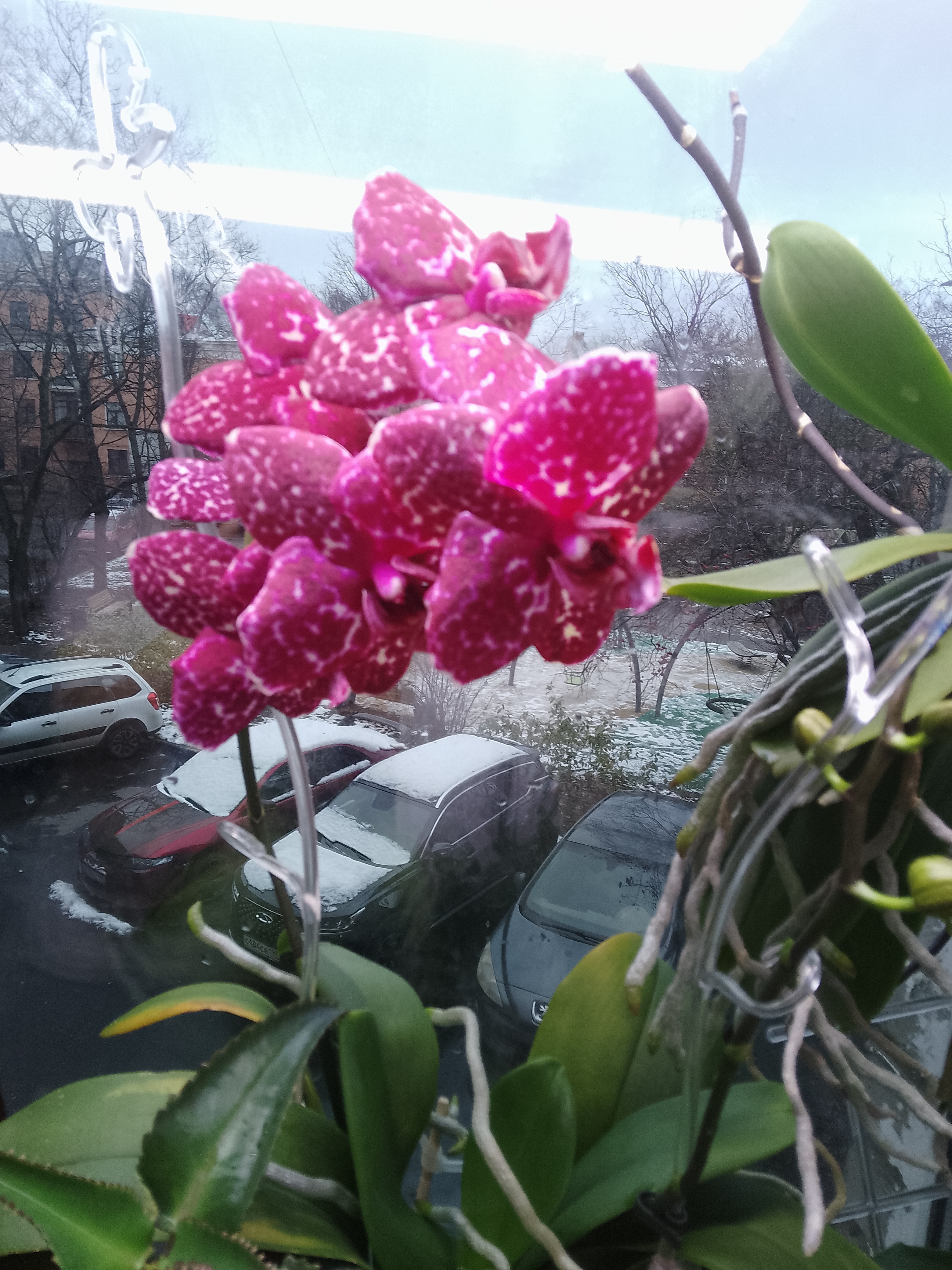 Преимущества: Неприхотливый, охотно растит и листья, и корни, и цветоносы. Два цветоноса одновременно, с 6-ю цветками на каждом (возможно это не предел его возможностей). Цветки плотные, "бархатные". У меня ещё и года нет как живёт.