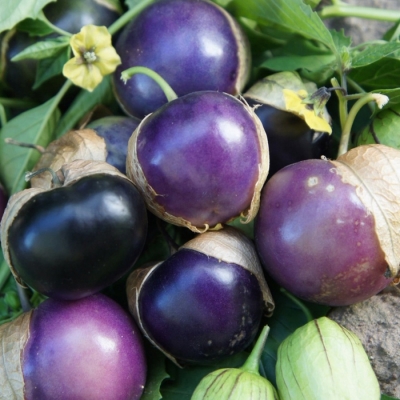 Плоды физалиса овощного представляют собой округлые или эллипсовидные ягоды размером 3-5 (7) см в диаметре и массой от 30 до 70 г. Их окраска варьируется: светло-жёлтая, бледно-зелёная, фиолетовая или пурпурная. Вкус плодов кисло-сладкий или сладковатый.