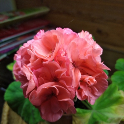 Листья у пеларгонии крупные, что придаёт растению дополнительный декоративный эффект. Окраска соцветий сложного лососевого цвета, что делает их особенно привлекательными на фоне зелёной листвы. Плотность соцветий позволяет культуре выглядеть очень эффектно даже в небольших композициях. Яркая насыщенность цвета делает ее идеальным выбором для создания ярких акцентов в интерьере.