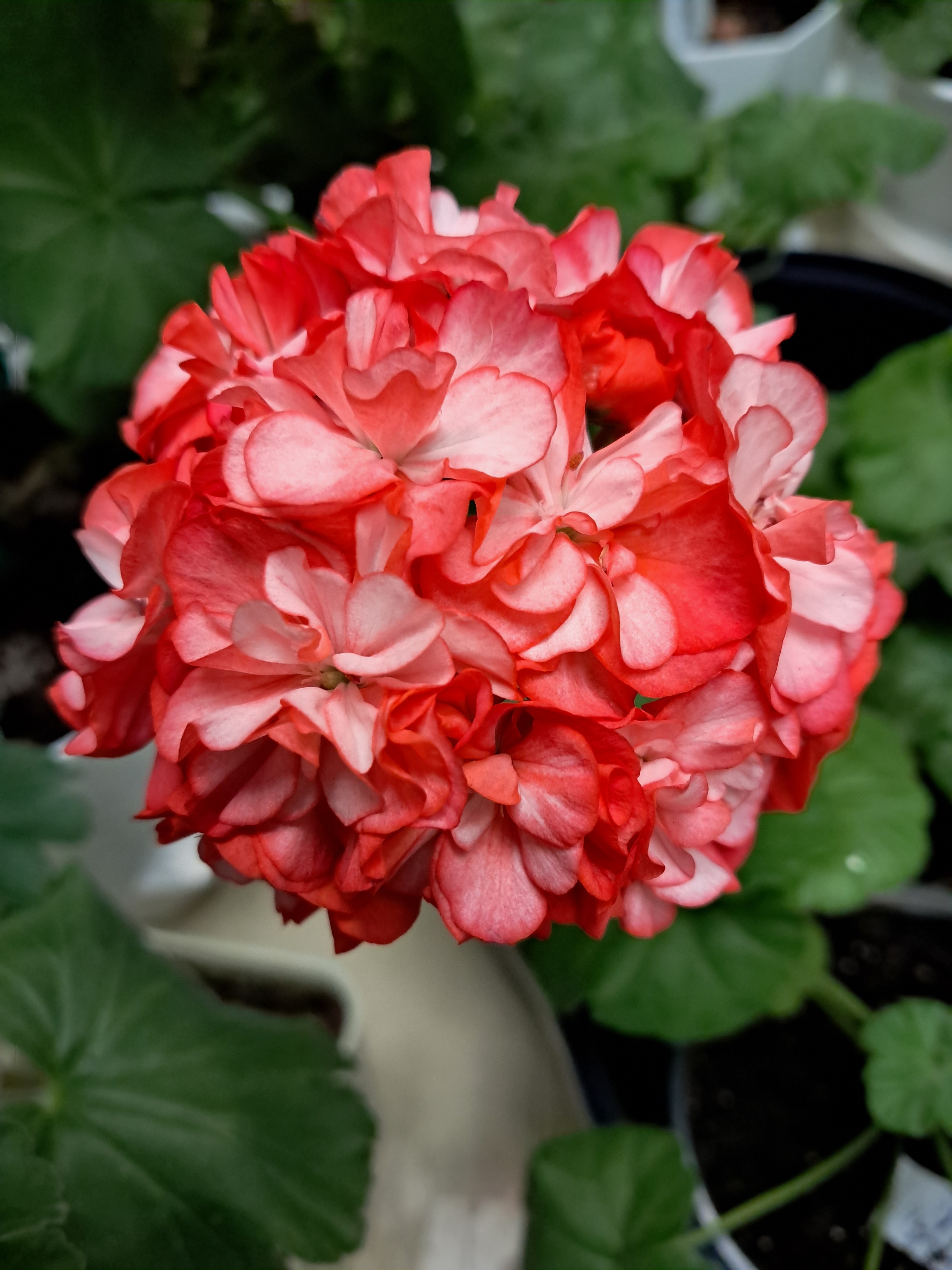 Цветоносы также отличаются прочностью и формируют рыхлые зонтиковидные соцветия с крупными махровыми цветками. Бутоны имеют розовидную форму и окрашены в насыщенные розово-оранжевые тона с белым центром и светлой подложкой. Это сочетание цветов создает эффектное зрелище на любом фоне.