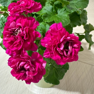 Цветоносы у пеларгонии короткие и крепкие, что позволяет им удерживать обильные шапковидные соцветия с махровыми бутонами в виде маленьких розочек. Яркая малиновая окраска цветов привлекает внимание и создает атмосферу праздника в любом интерьере.