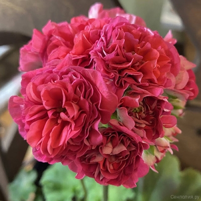 Цветение пеларгонии ЮГ‑Вино Любви — это настоящее зрелище. Цветки собраны в плотные шаровидные соцветия, которые выглядят особенно эффектно благодаря своей форме и размеру. Огромные густомахровые цветы имеют насыщенную малиново-розовую окраску с множеством переходов цвета, что создает ощущение глубины и объема.