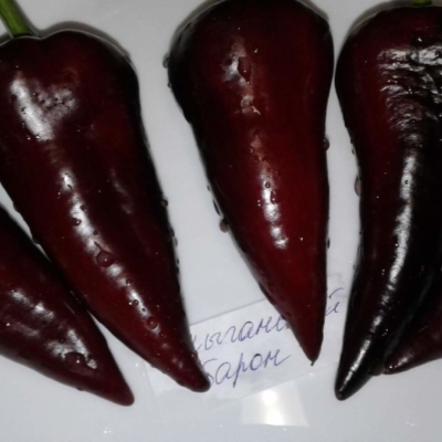 Плоды перца Цыганский Барон имеют конусовидную форму с пониклым положением на растении. В технической спелости они окрашены в темно-фиолетовый цвет, а в биологической становятся темно-красными. Гладкая глянцевая поверхность плодов привлекает внимание своим блеском.