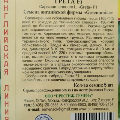 Грета – это гибридный сладкий перец, разработанный компанией Greenomica Ltd и допущенный к использованию в 2018 году. Этот сорт имеет высокую урожайность и отличается прекрасными вкусовыми качествами.