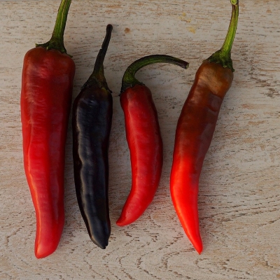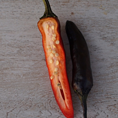 Плоды данного сорта имеют размер от 5 до 7 сантиметров и остроконечную форму. В технической спелости они обладают темно-фиолетовой окраской, почти черной, а в биологической спелости – красной. Столь необычная окраска делает перец очень привлекательным и интересным для выращивания.