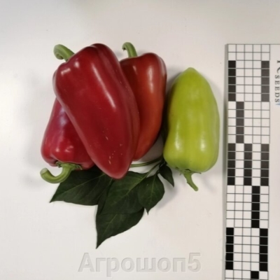 Плоды имеют треугольную форму длиной до 15 см и массой от 130 до 160 граммов. Они отличаются глянцевой поверхностью и стенками толщиной от 6 до 8 мм, что делает их не только вкусными, но и удобными для транспортировки. В технической спелости плоды окрашены в светло-зеленый цвет, а по мере созревания становятся ярко-красными.