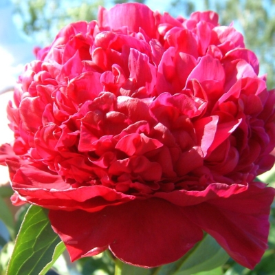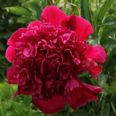 Цветки махровые и шаровидные. Их размеры средние. В среднем их диаметр составляет до 15 сантиметров. Расцветка у пионов этого сорта красно-малиновая с мелкими белыми штрихами на краях. Цветки на кустах одиночные.