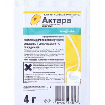 Препарат Актара представляет собой высокоэффективный инсектицид, имеющий форму водно-дисперсионных гранул. Механизм воздействия препарата является контактным, системным, контактно-кишечным. Действует Актара как защитный пестицид. Препарат является умеренно опасным для человека и высокоопасным для пчел.