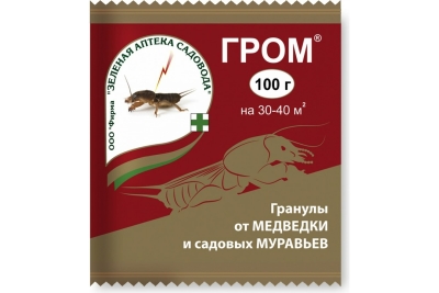Гром представляет собой препарат-приманку. Примечательно, что расшифровка названия – «гранулы от медведки». Средство относится к инсектицидам, химический класс – фосфорорганические соединения. Производится препарат на территории России.
