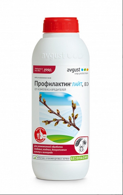Профилактин Лайт выпускается в форме эмульсии, которую надо смешивать с водой. В препарате содержится минеральное масло, способное создать подобие пленки на ветвях деревьев и кустов. Она препятствует поступлению воздуха к паразитам, тем самым убивая их на стадии пробуждения. Средство сохраняет действие не меньше месяца.