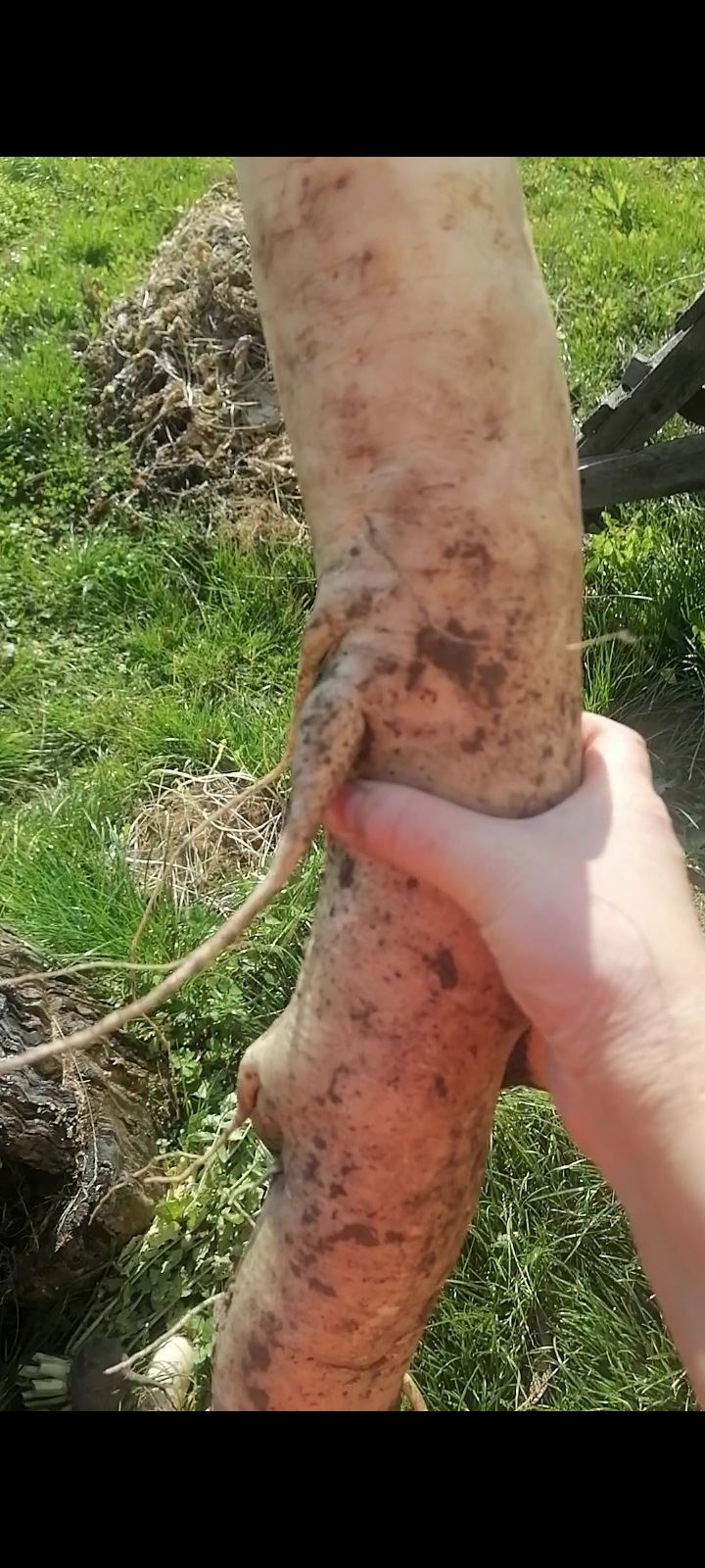 Комментарий: Выкапывать надо осторожно: может часть обломиться и остаться глубоко в земле. Подкапывать и постепенно "вытаскивать".. лучше вдвоём заниматься этим. А вообще плод частично выходит из-под земли, пока растёт и торчит из неё