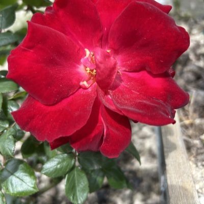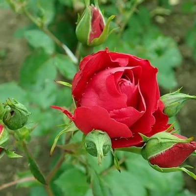 Малиново-красные яйцевидные бутоны раскрываются в плоскочашевидные крупные цветы с диаметром примерно в 8 сантиметров. Розы полумахровые, стандартное количество лепестков – 15-25, но иногда попадаются и цветы, содержащие 30-35 лепестков. Выглядят цветы очень привлекательно, поскольку окрашены в темно-красные «цепляющие» тона. Иногда окрас может быть и более глубоким, винно-красным.