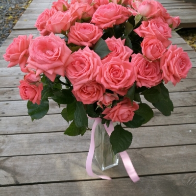 Цветки розы имеют диаметр от 5 до 7 см и состоят из 30-60 лепестков. Их окраска варьируется от лососево-розового до персикового оттенка, создают теплую атмосферу в любом садовом ландшафте. Цветы формируются в соцветиях по 3-5 штук на стебле, что добавляет пышности и объема растению. В полном роспуске цветки не показывают серединку, а их укладка лепестков выглядит особенно привлекательно.