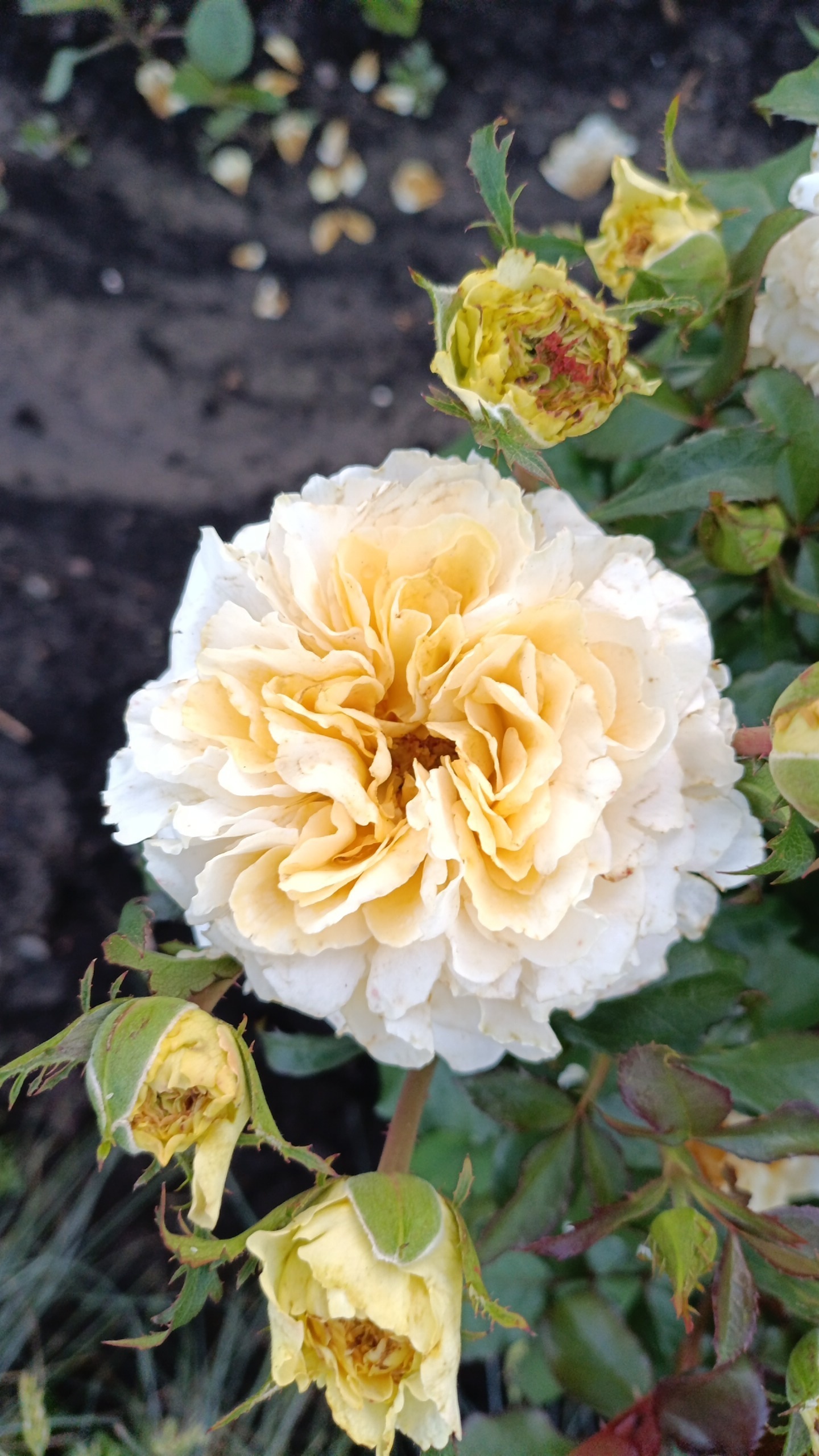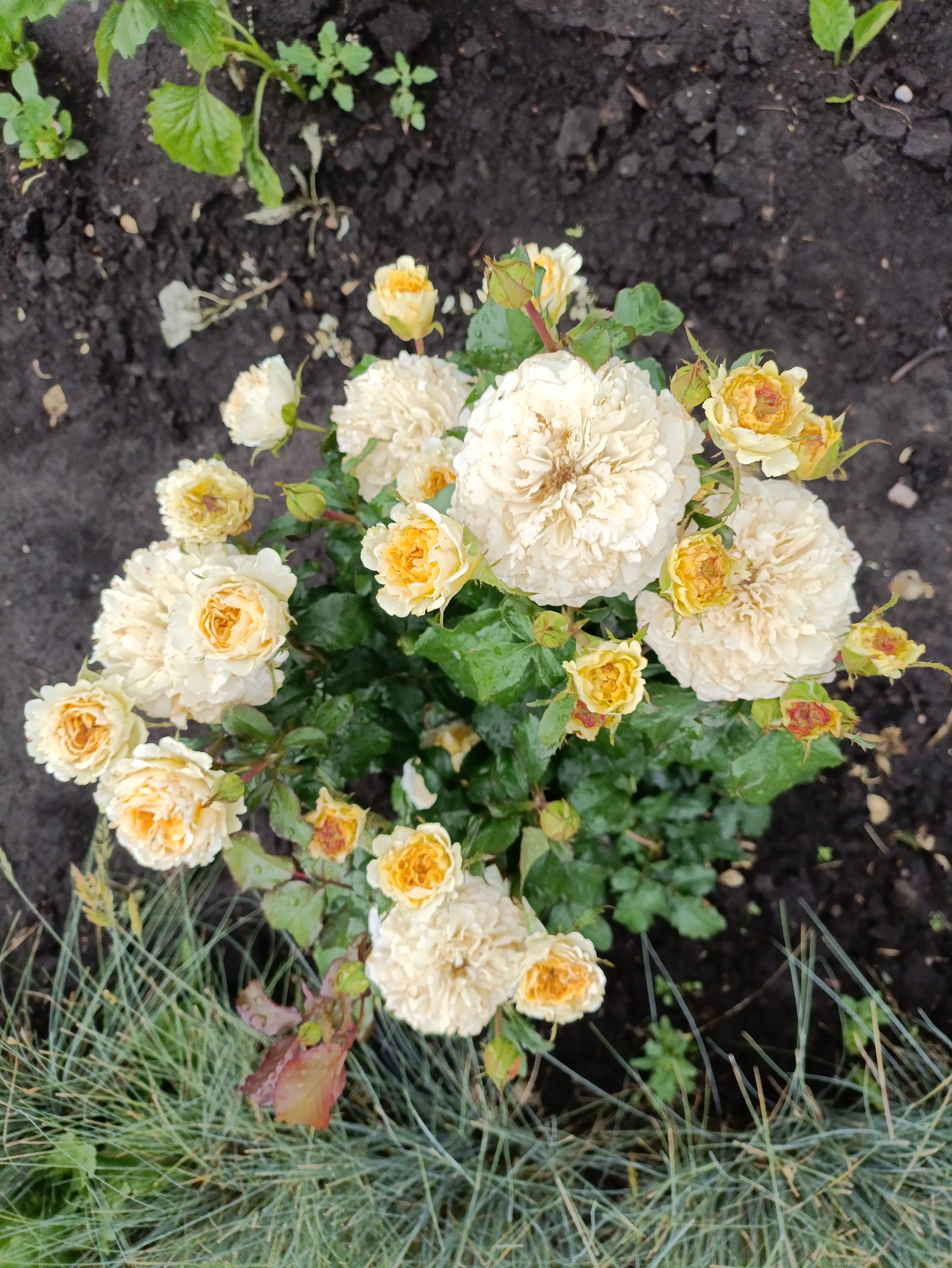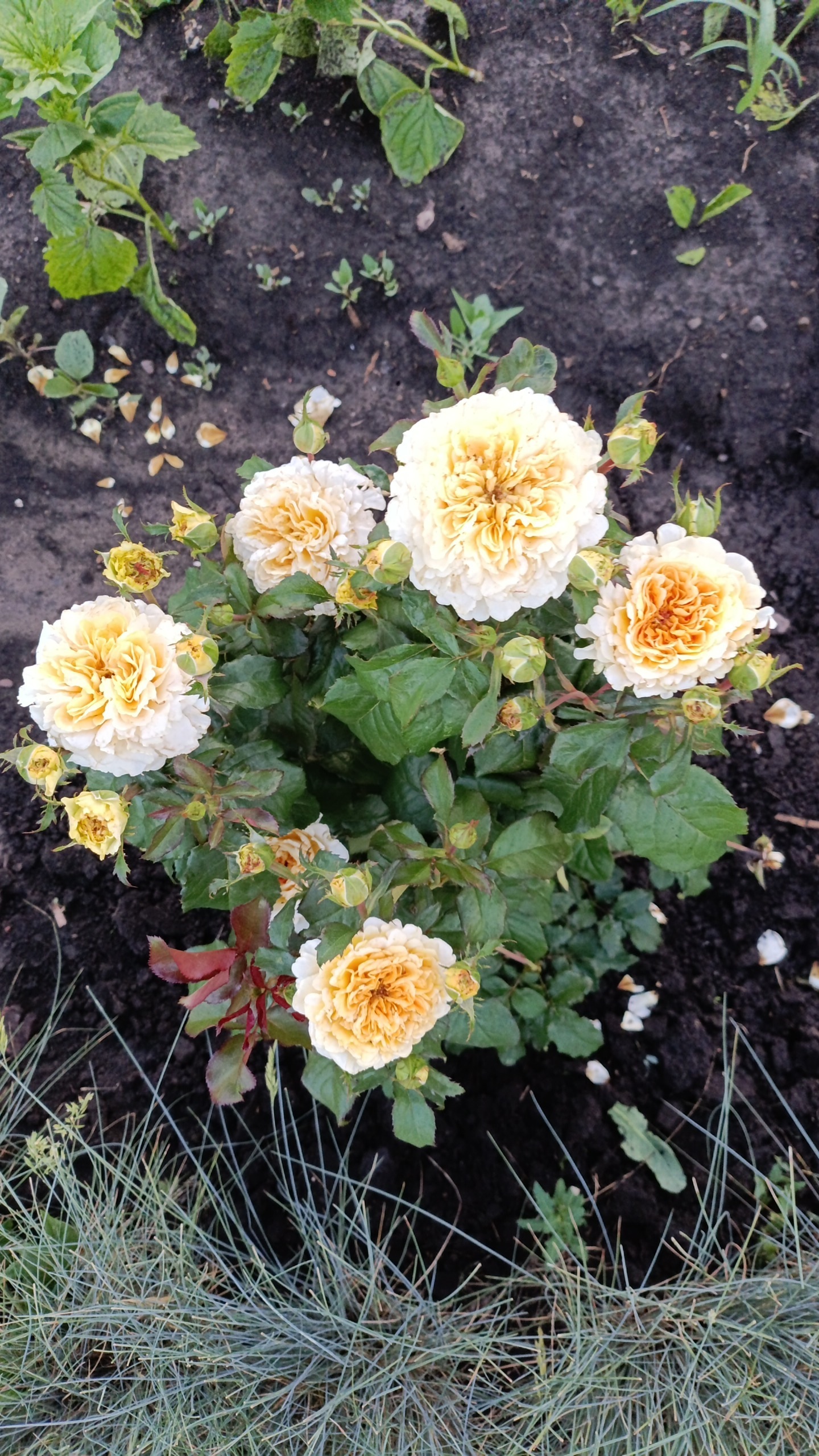 Двухцветность у этой розы сильно выражена. Причём меняется не только яркость оттенков, но и внешний вид цветка. Закрученная серединка постепенно распрямляется, но остается пышно набитой. Без цветов кусты остаются очень короткое время, а затем принимают вид огромного букета, густо покрытого сливочно-абрикосовыми бутонами.
