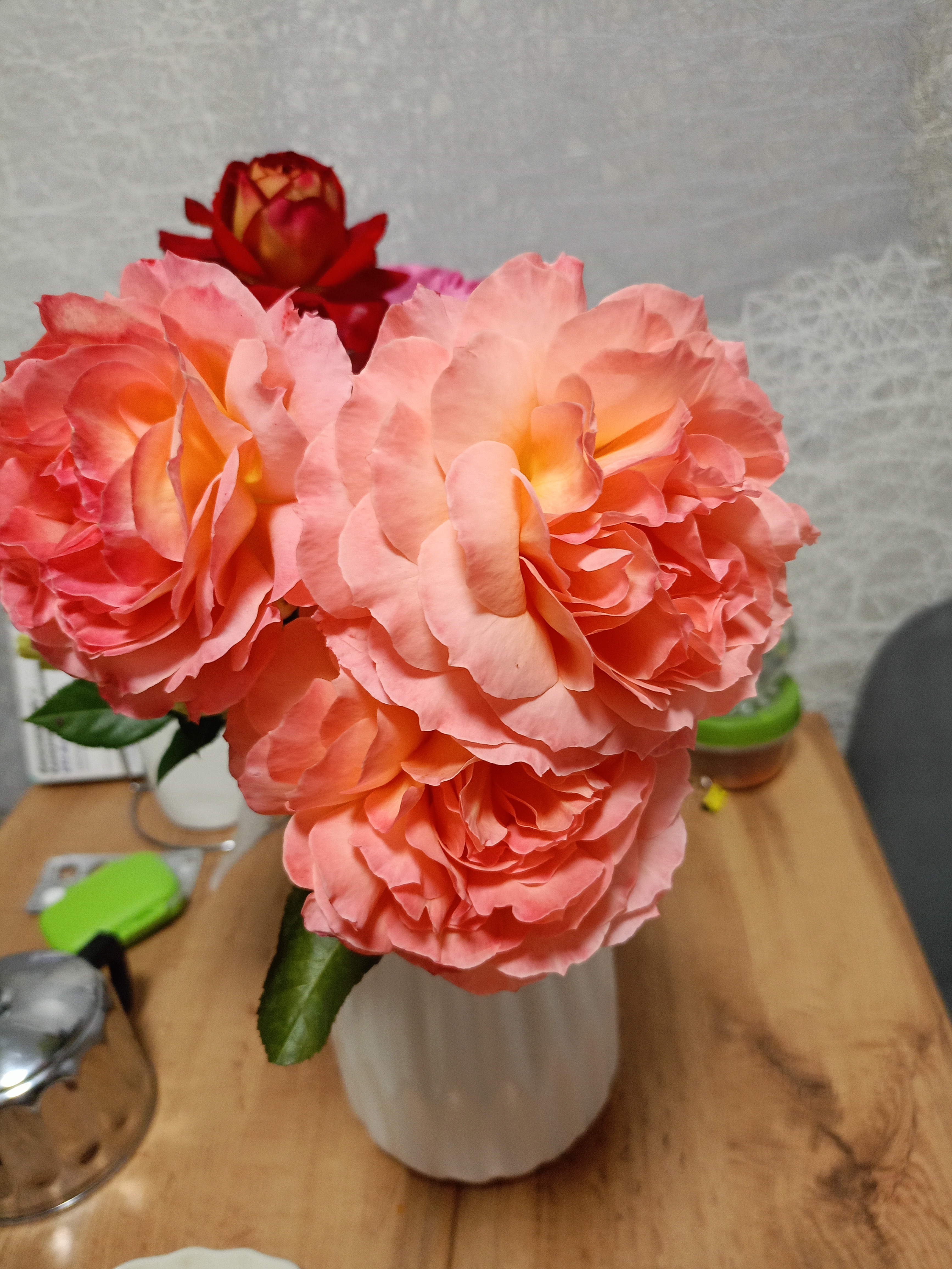 Цветки состояли из плотно расположенных лепестков, необычно закрученных в бутон. На одном стебле распустилось по 2-3 розы.