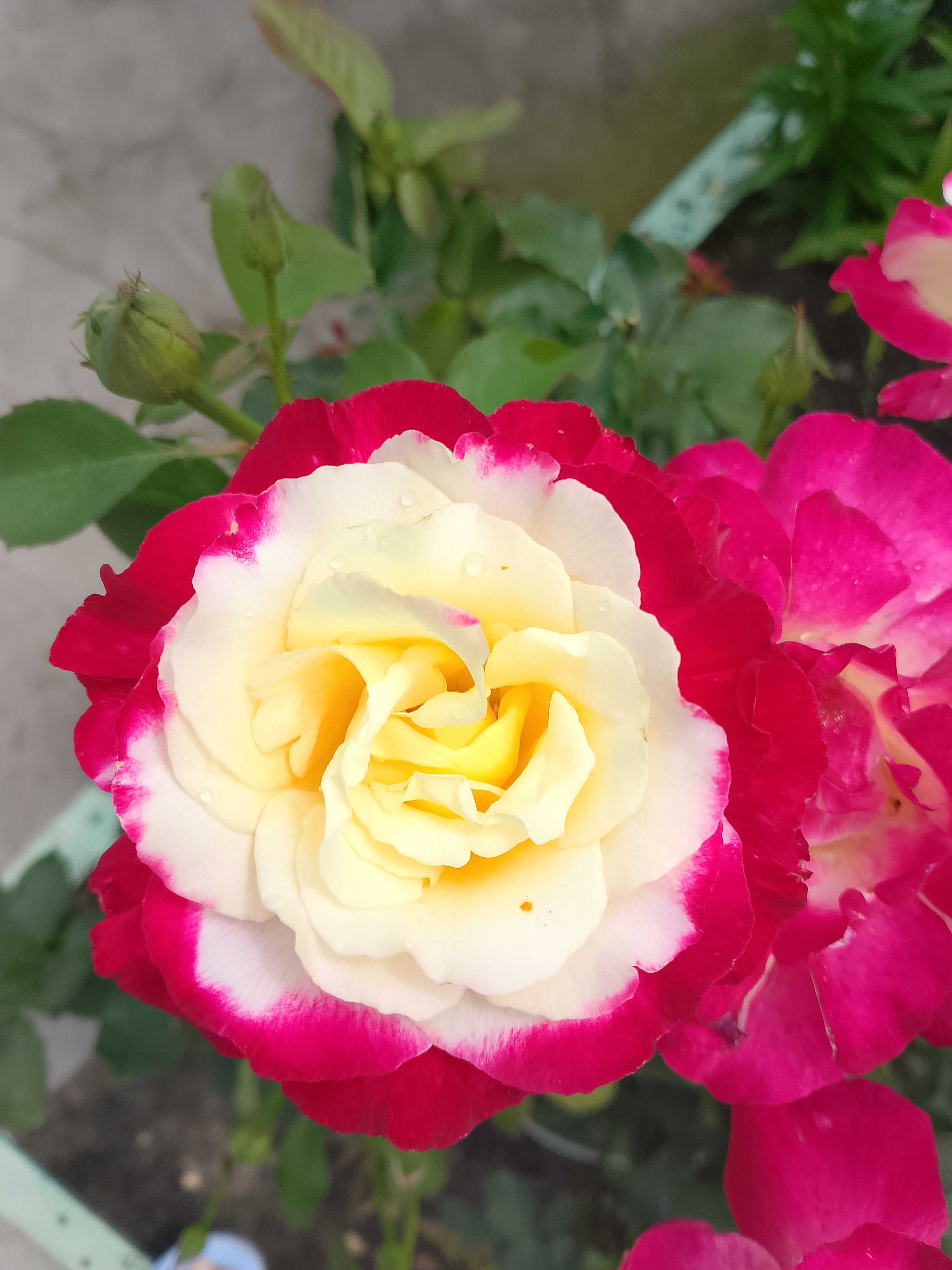 Окрас у роз необычный, состоящий из нескольких оттенков. Как правило, серединка у розы кремовая, а внешние лепестки – малиновые. Кроме того, у каждого цветка есть малиново-красное обрамление (кайма). Невероятно красивого окраса цветы обладают ярким ароматом, в котором слышны фруктовые и сладкие нотки.