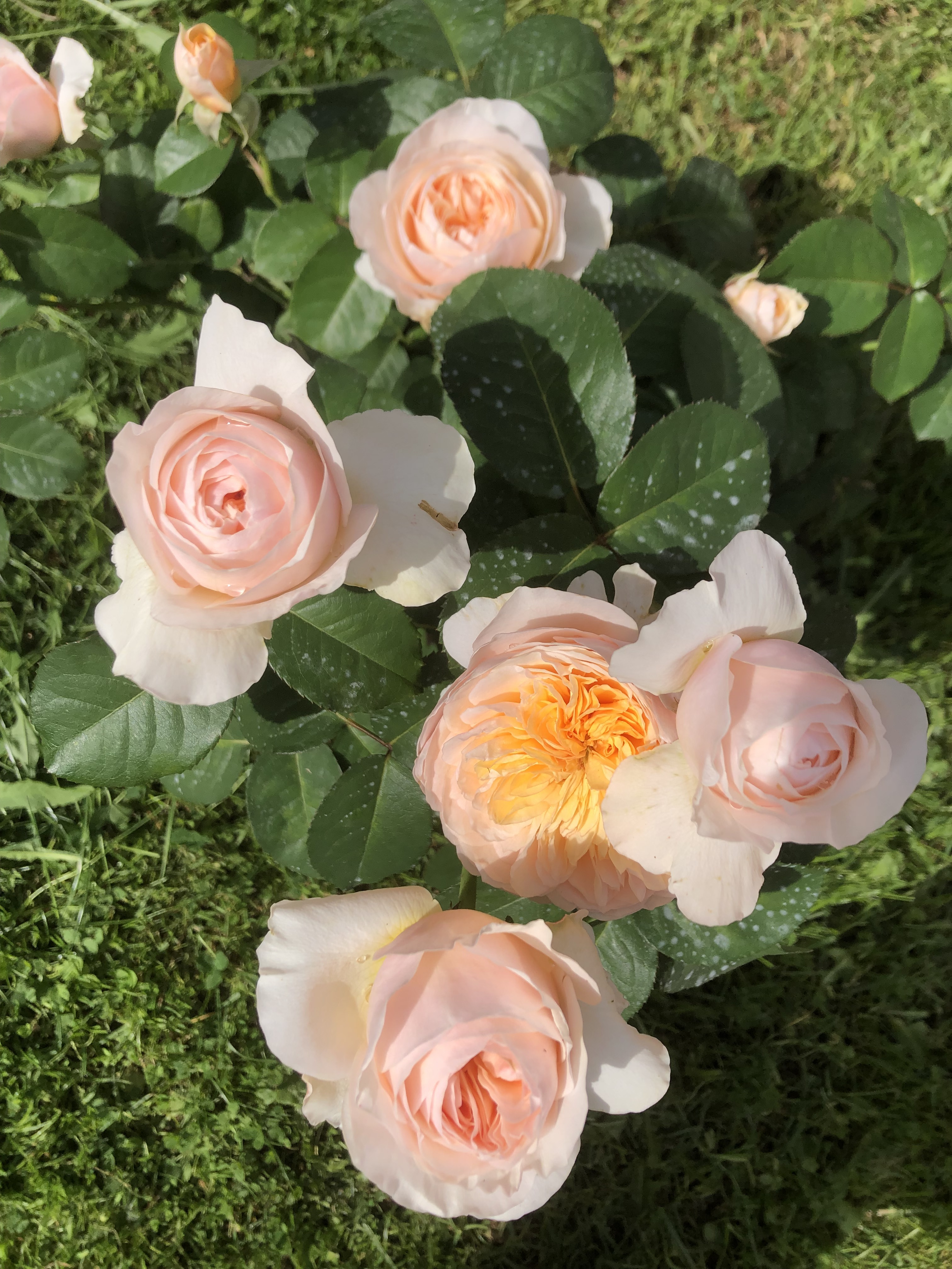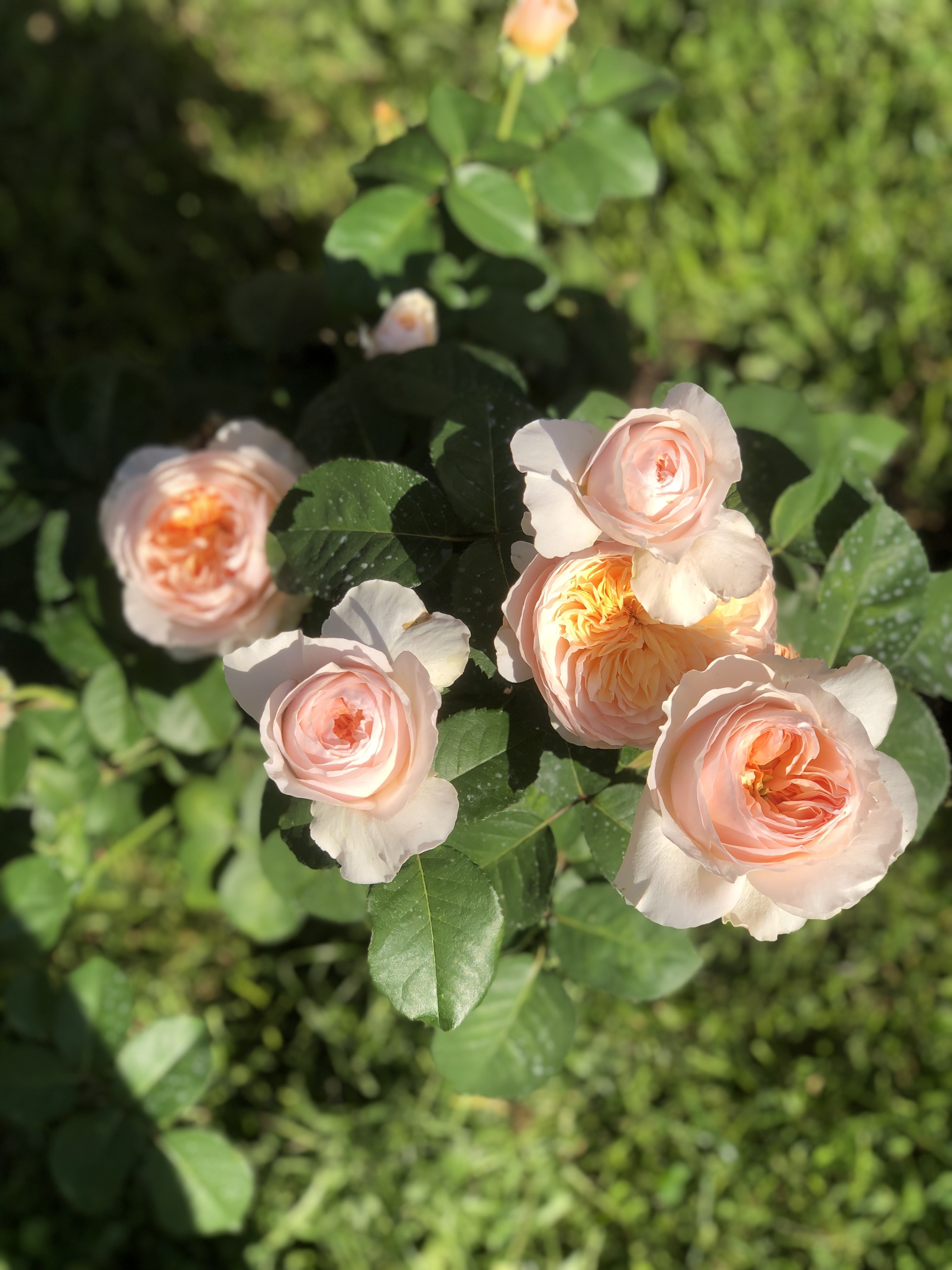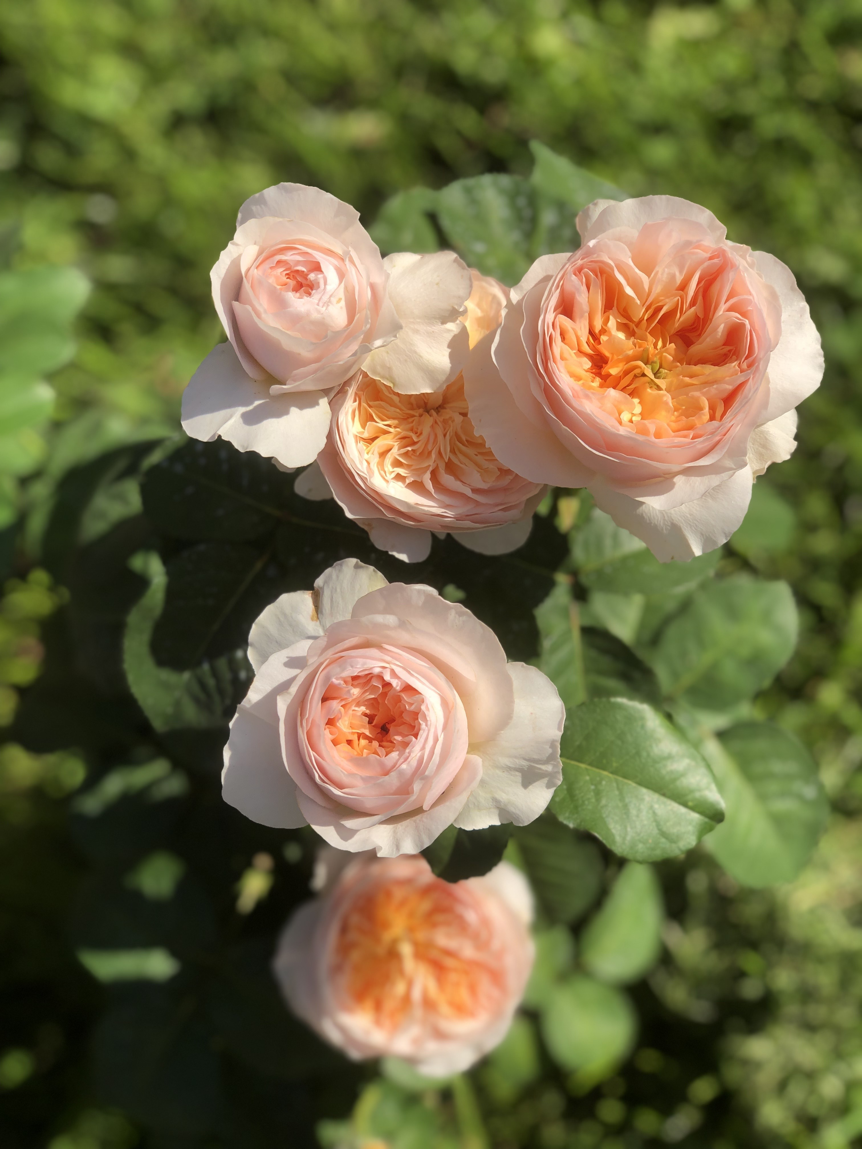 На сочных побегах посажены одиночные пышные бутоны абрикосового цвета, которые раскрываясь, превращаются в шикарные розы, внешне напоминающие пионы. Объемный цветок, диаметр которого достигает 10 см, имеет плотную структуру, состоящую из 85-90 тонких лепестков с волнистыми краями. Махровая роза приобретает нежно-персиковый или светло-абрикосовый окрас. Цветущие розы издают едва уловимый, но очень приятный аромат, в котором слышны нотки сладкой ванили, чайной розы и сирени. Чтобы розы были максимально крупными, необходимо обрезать кусты в период вегетации.