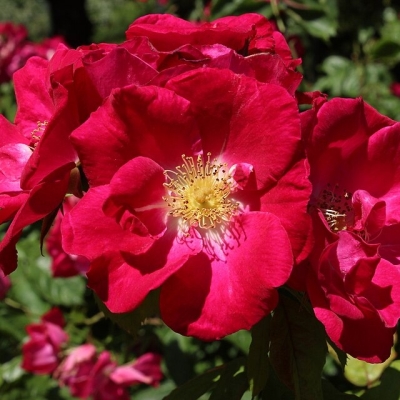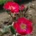 У Евы карминово-красный оттенок цветов с белой сердцевиной. Окраска насыщенная, сами цветки полумахровые, до 8 лепестков. В диаметре роза может достигать 7 см. На одном стебле формируется до 10 цветов. У Евы средний по силе аромат, но это нельзя считать ее недостатком.