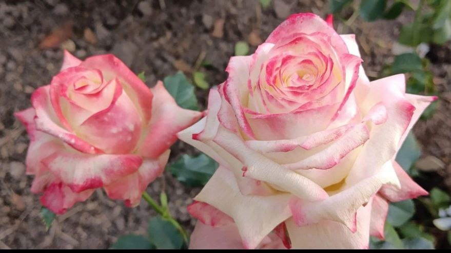 Крупные бутоны состоят из плотно расположенных лепестков. Окрас описать непросто. Лепестки нежного кремового цвета, по краям окрашены в ярко-красный тон. Если роза будет расти в тени, то яркость окраса она потеряет. У меня кустик расположен на солнечном участке, поэтому окрас у нее очень яркий. Эта роза долго держит цветки, примерно 10 дней, при этом им не страшна непогода. Кстати, в зависимости от периода цветения окрас цветка меняется.