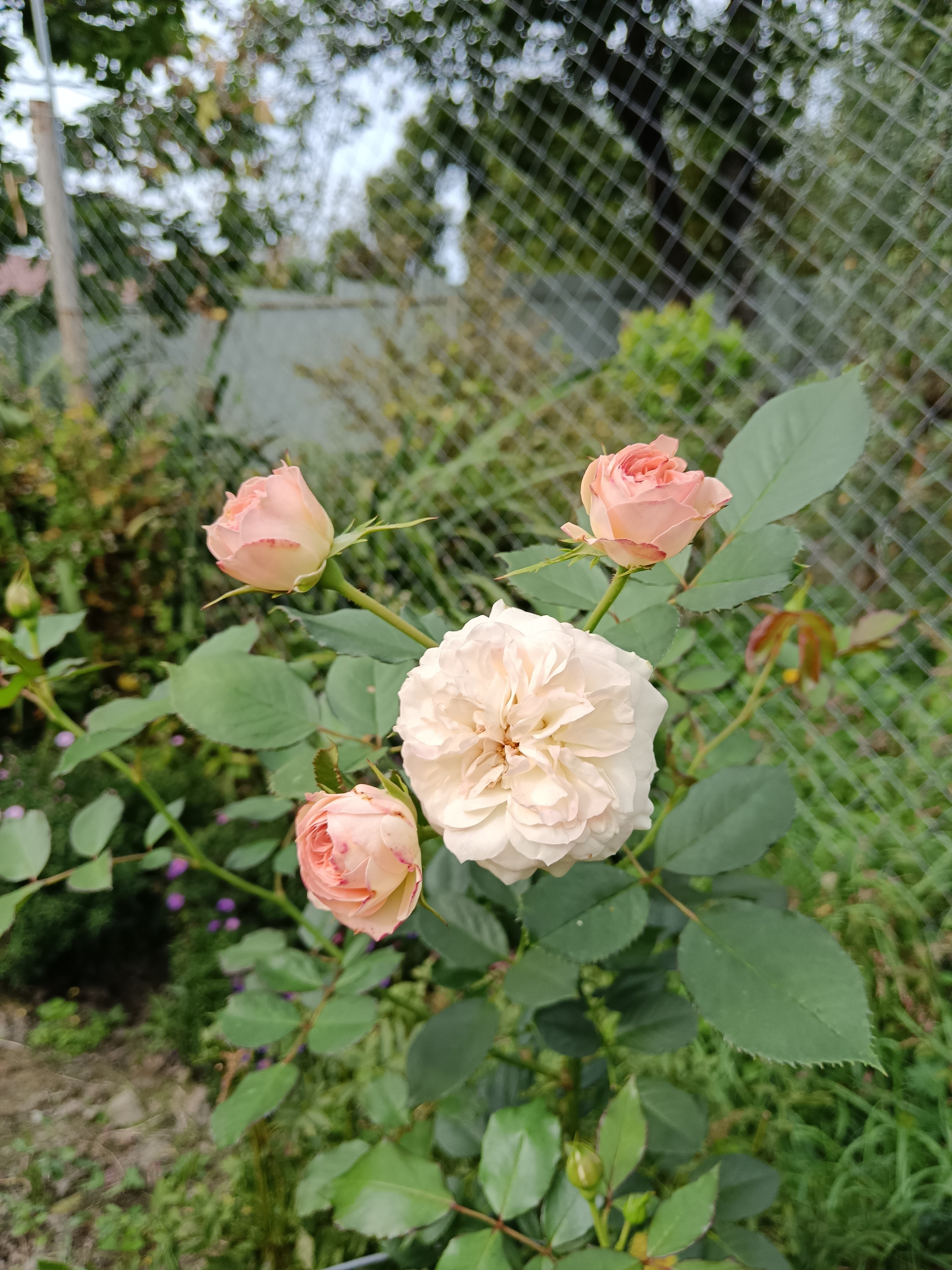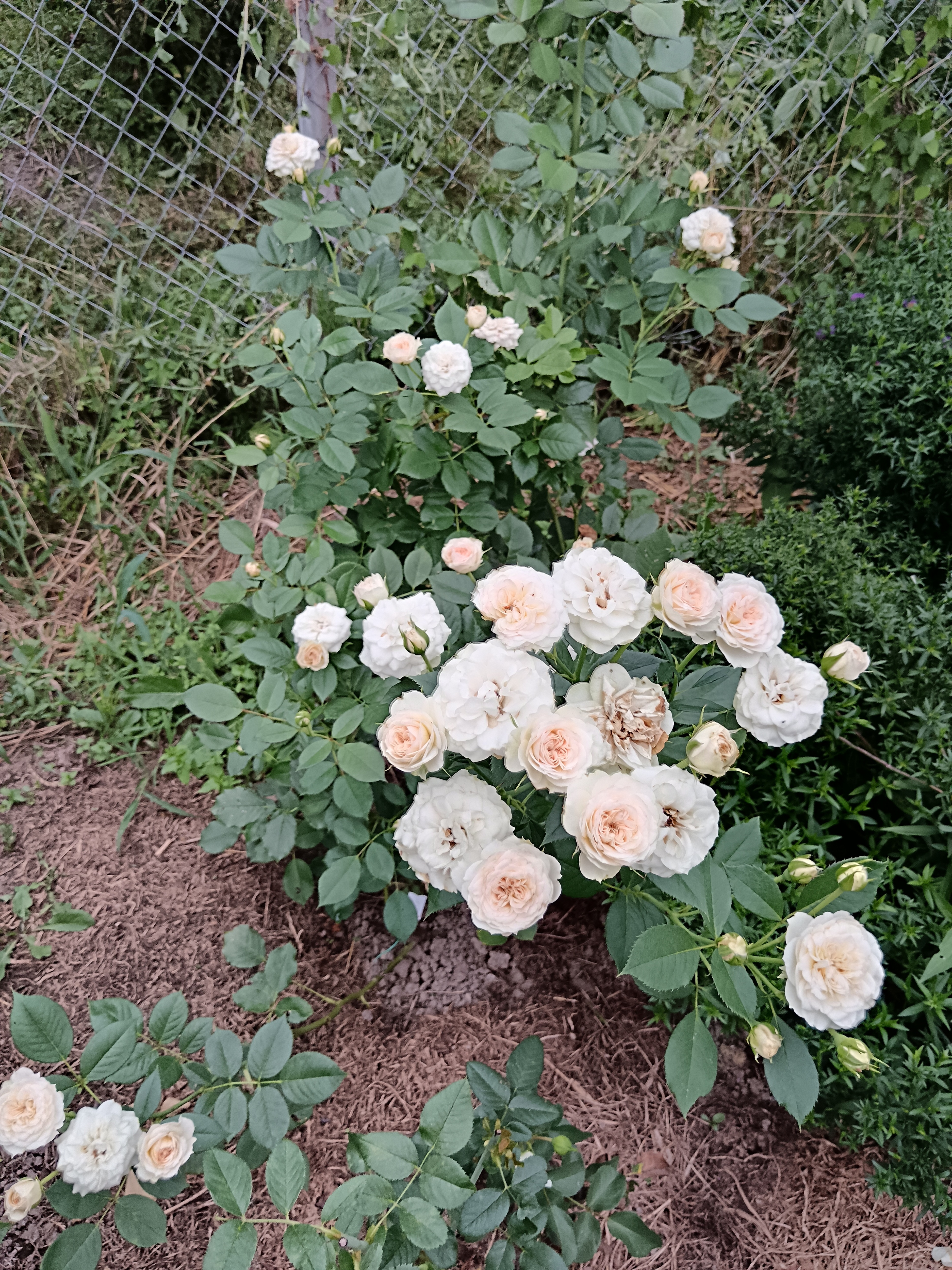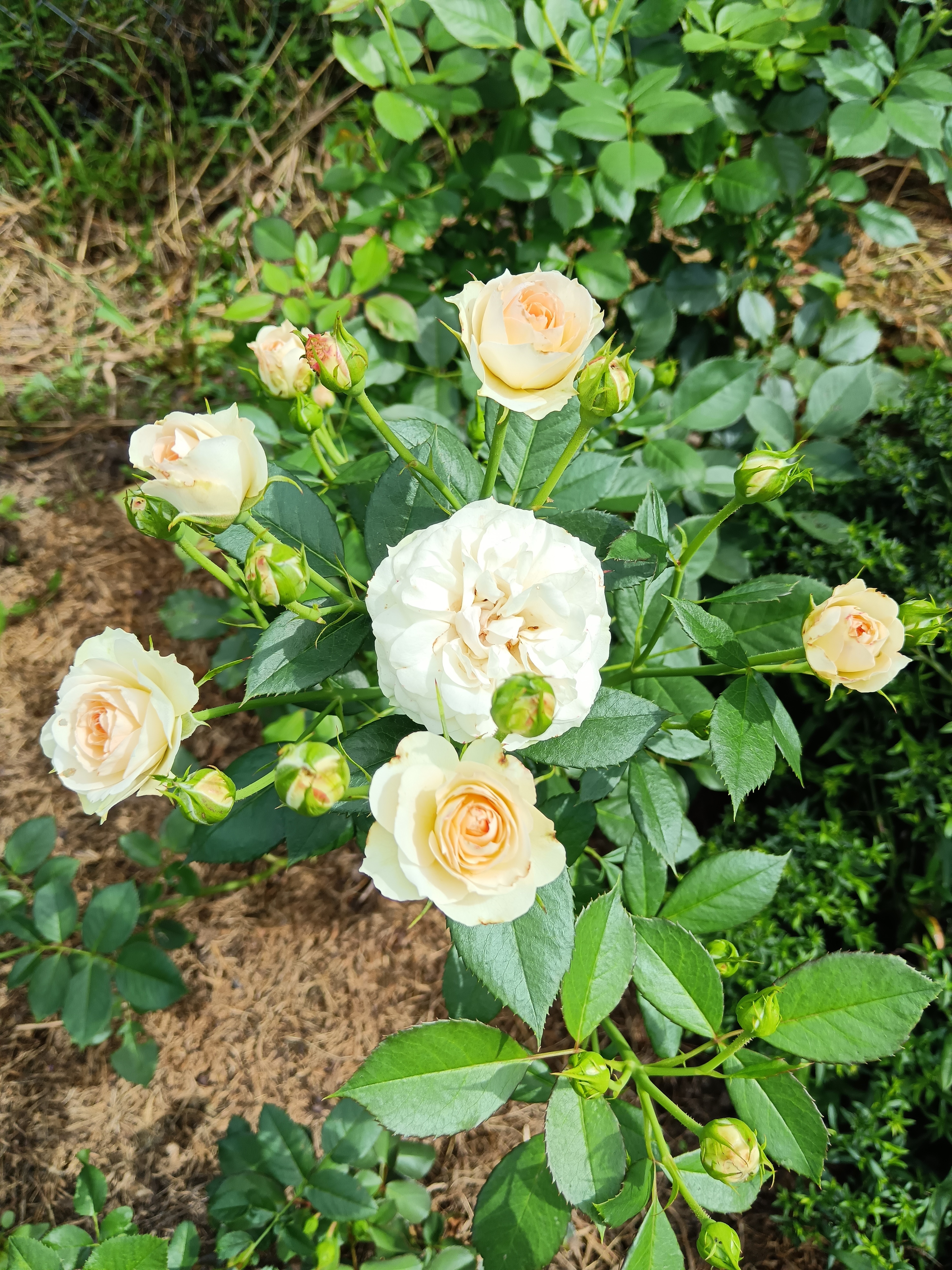 Преимущества: Непрерывно цветущая, очень красивая роза с обильными соцветиями нежной бело-розово-кремовой окраски. Куст мощный, сильно разветвлённый. Это моя любимица.