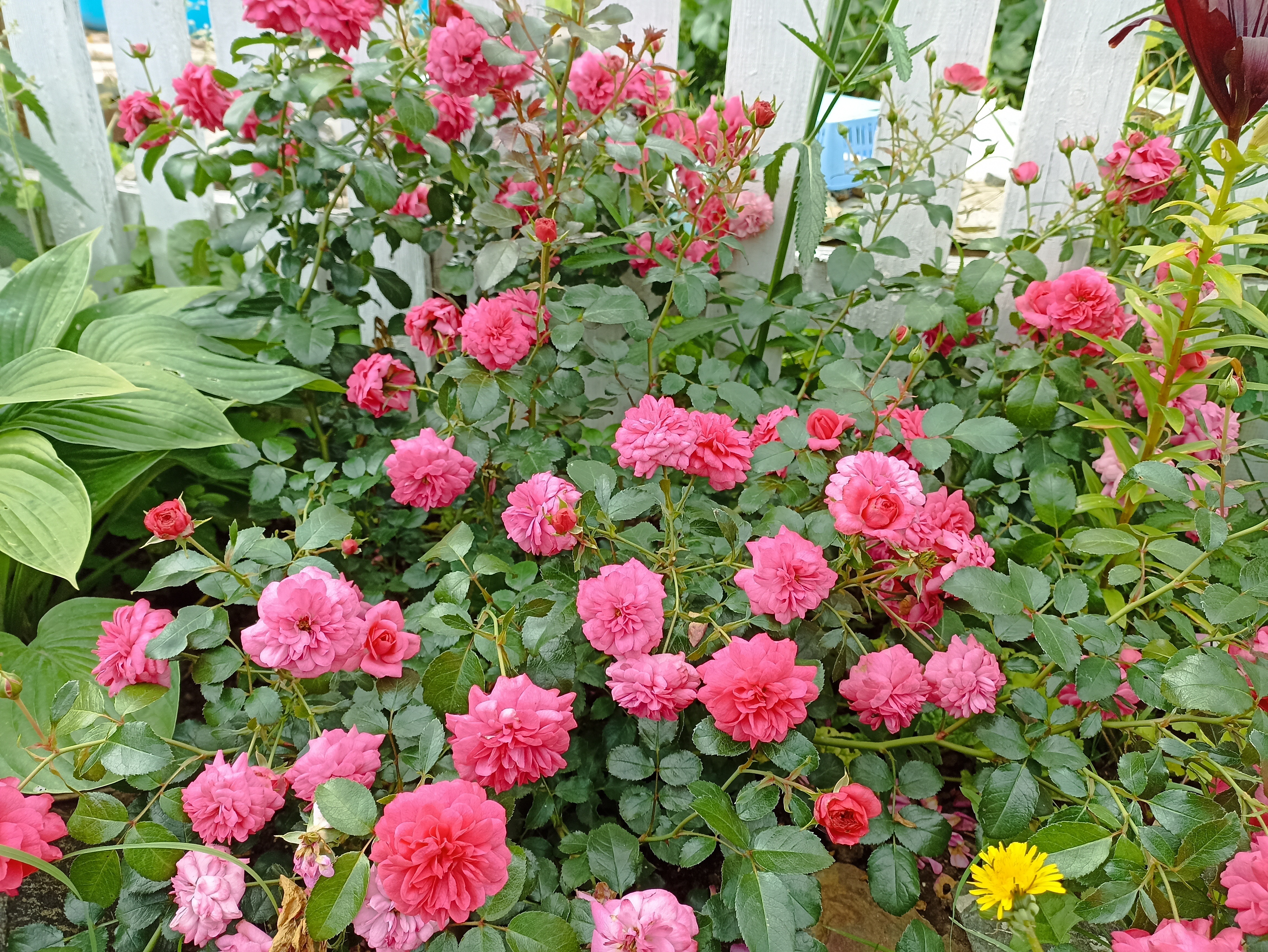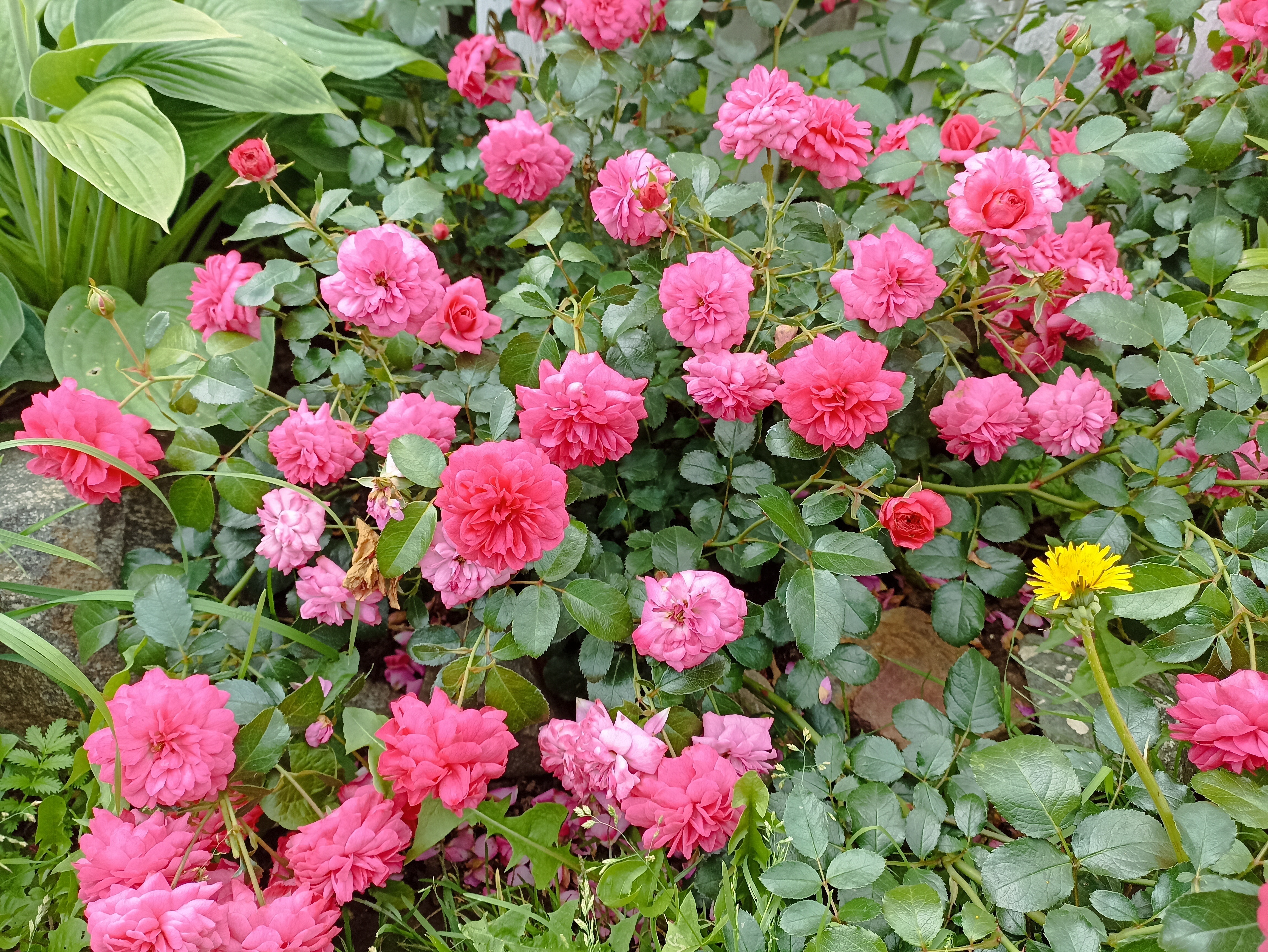 Образование цветов идёт крайне интенсивно. Как только оно начнётся, будет идти непрерывно. Ориентировочно это происходит в течение июня. Затем наслаждаться цветками можно будет в июле, августе и даже в сентябре. Густомахровая (до 80-85 лепестков) роза окрашена всегда в один цвет – ярко-розовый.