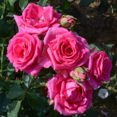 Среди преимуществ розы можно выделить ее крупные и яркие цветки, которые обладают приятным ароматом. Куст этого сорта имеет полураскидистую форму и достигает высоты около 80 см. Листья темно-зеленые, ланцетной формы, с полуглянцевой поверхностью. У этого сорта мало шипов.