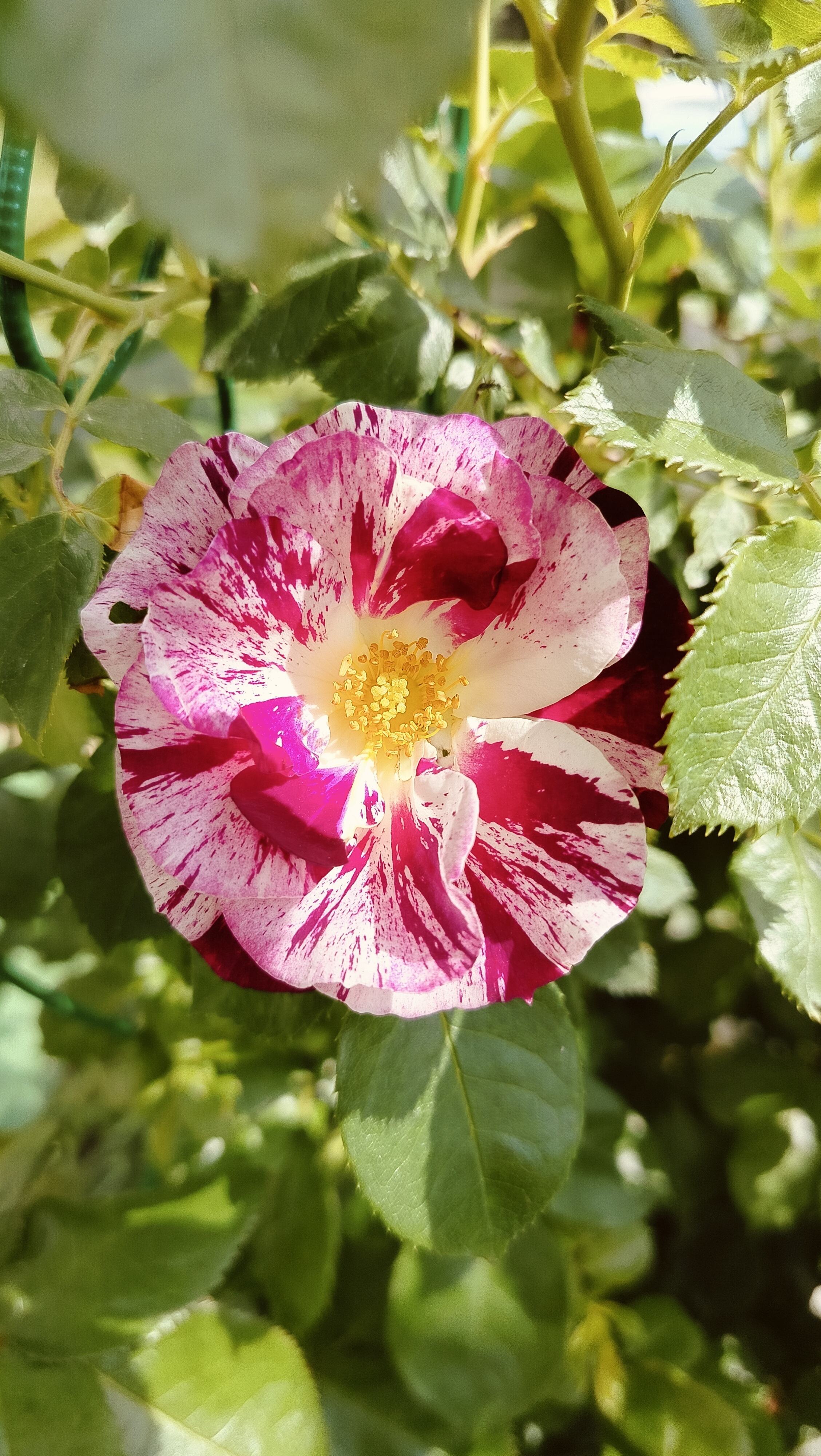 Плетистая роза Перпл Сплэш полностью отражает свое название, которое переводится как пурпурная вспышка. Ее цветки смотрятся среди зеленой листвы яркими брызгами и пятнами фиолетового, малинового и вишневого оттенков. Каждая роза уникальна по своей окраске и хотя не имеет обилия лепестков, но интенсивное цветение и разнообразие тонов превращает Purple Splash в особенный сорт.