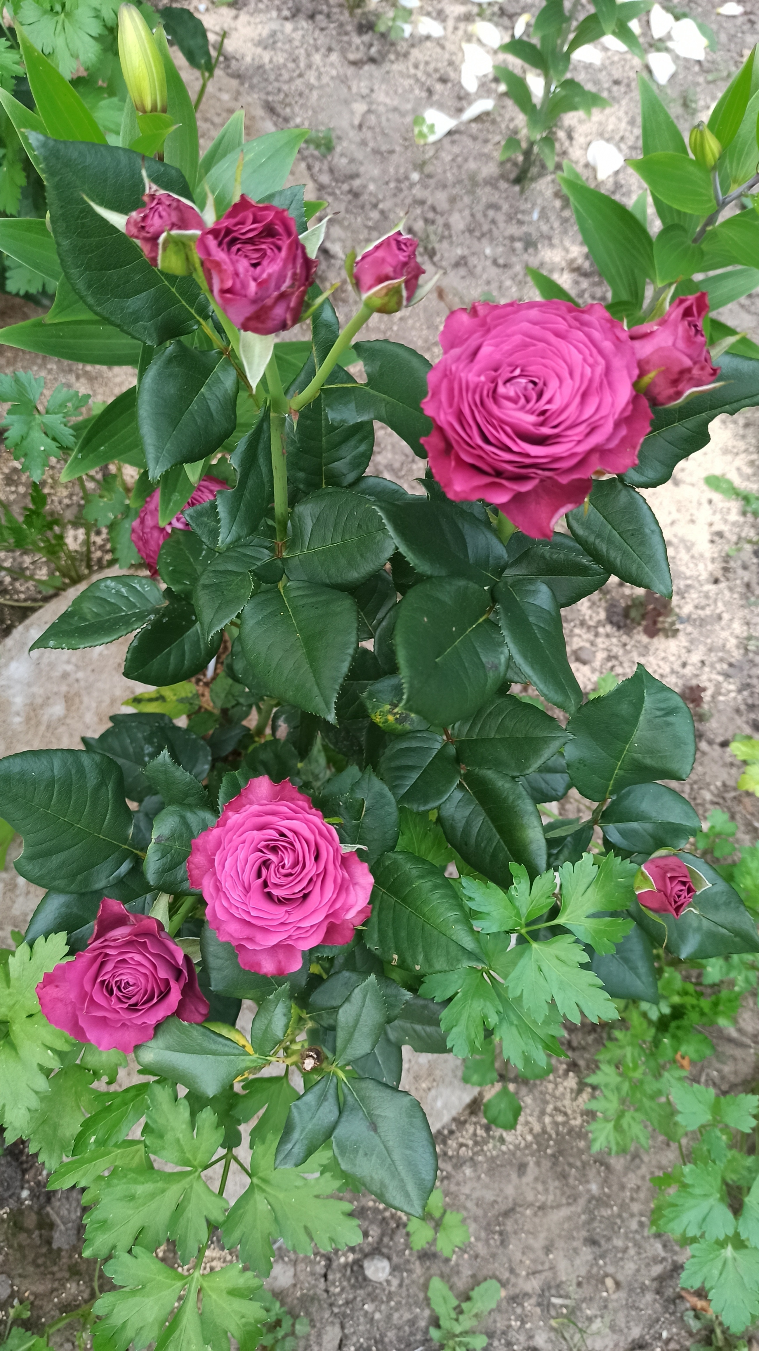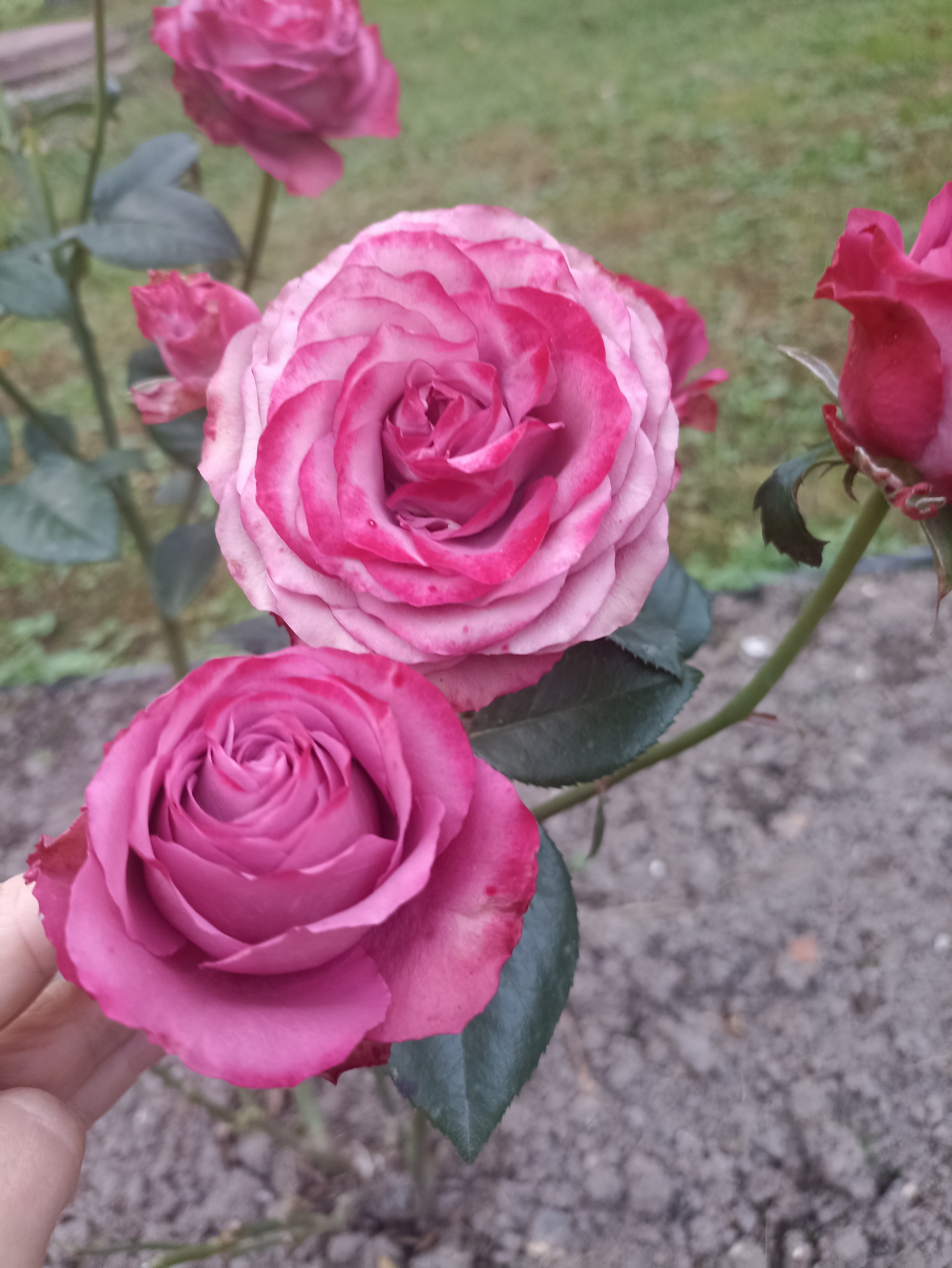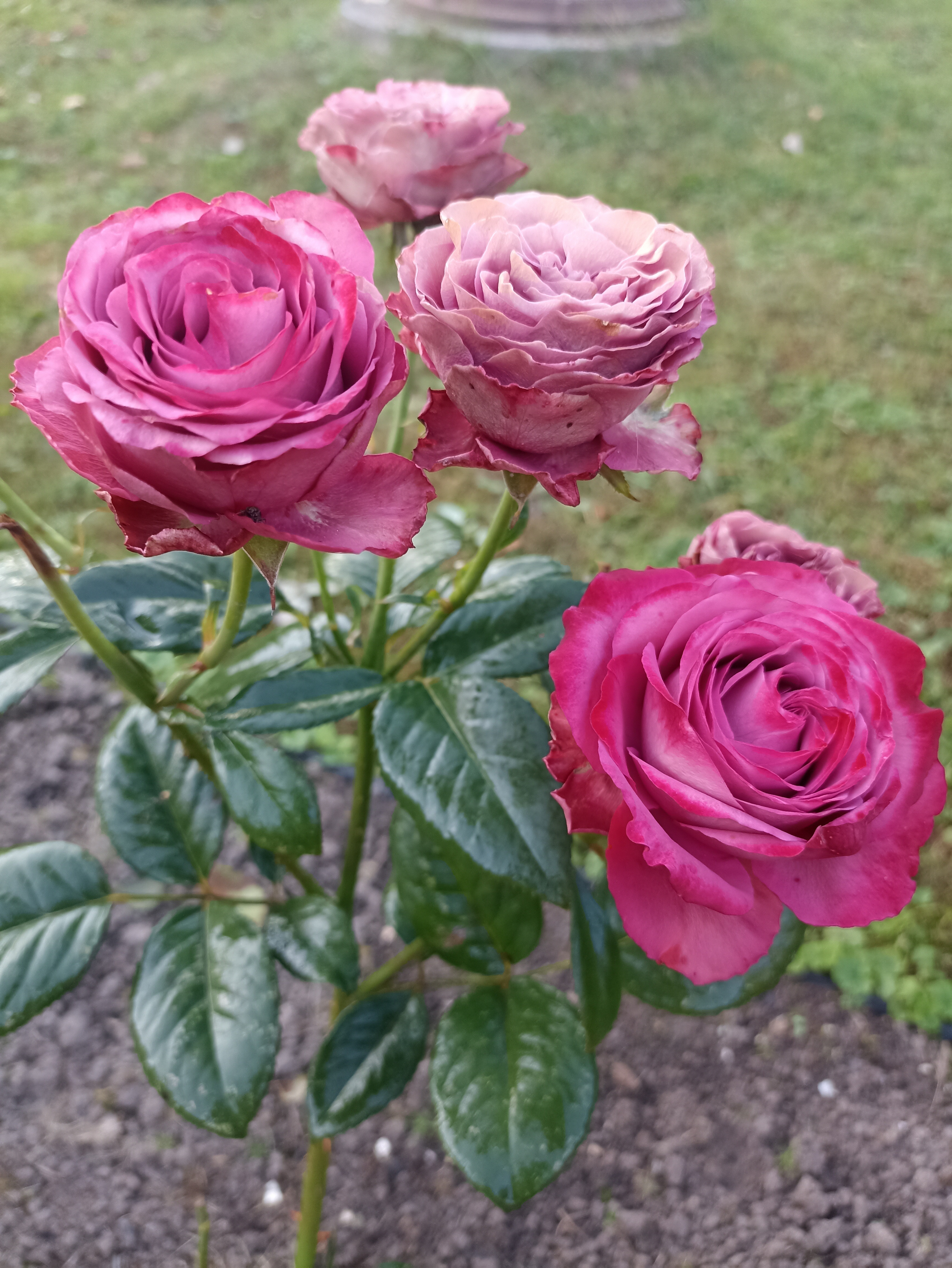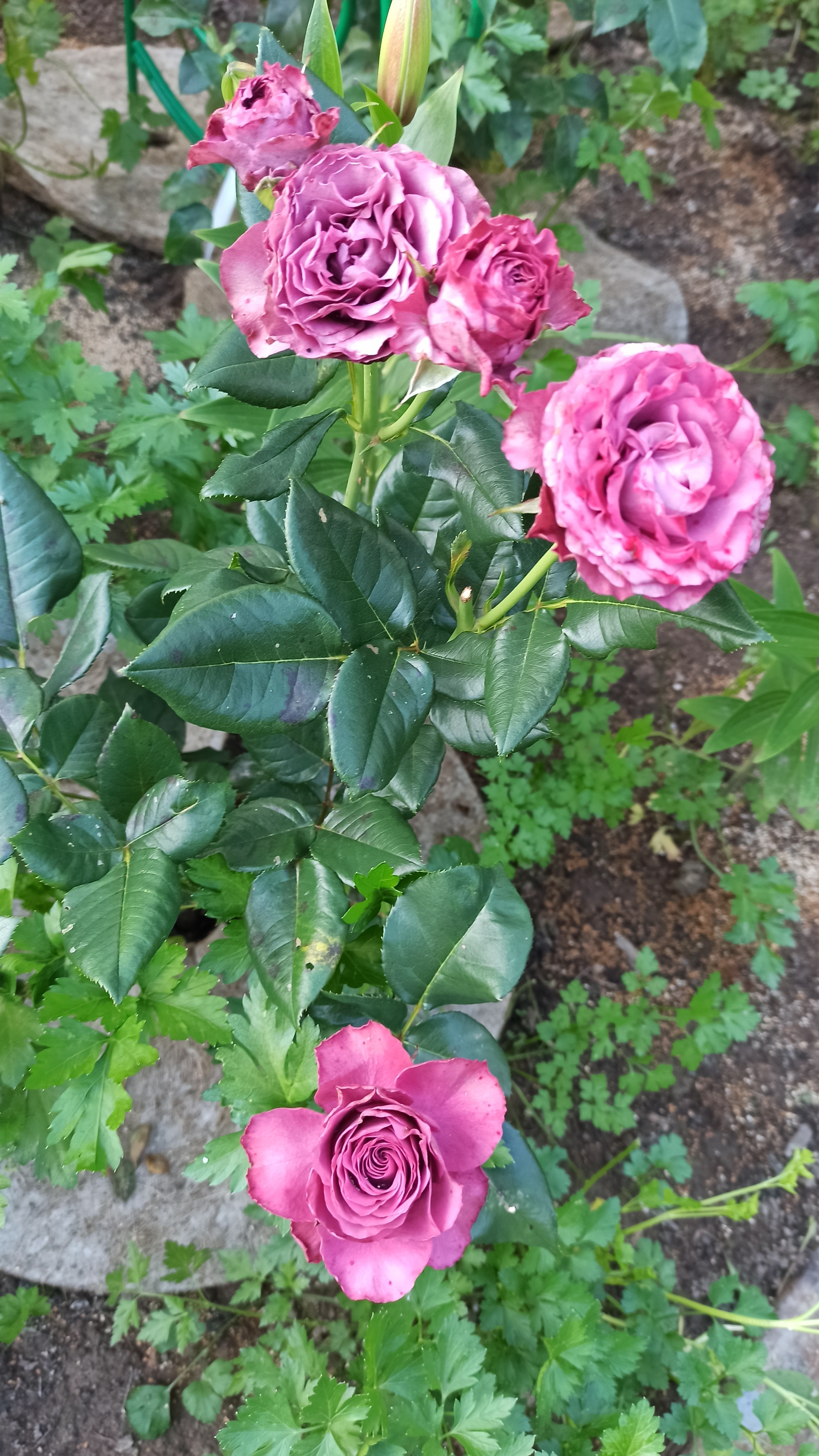 Преимущества: Роза у меня первый год, цвела в две волны, красивое сочетание тёмно-зелёной глянцевой листвы и тёмно розово-лиловый цвет цветков. Цветы густомахровые 8 см, долго цветут и меняют оттенок на более светлый лавандовый цвет. Ничем не болела, хотя лето было дождливое, прохладное.