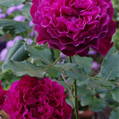 Цветки Вельвети Твайлайт имеют чашевидную форму диаметром от 8 до 10 см. Они густомахровые, состоящие из более чем 41 лепестка, которые образуют красивые гроздевидные соцветия. Цветение происходит волнами на протяжении всего сезона: одиночные цветы или небольшие букеты сохраняют свою декоративность долгое время. Основной окрас цветков варьируется от пурпурного до фиолетово-красного с ярко выраженными сиреневыми оттенками, особенно в прохладную погоду.