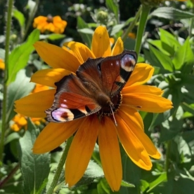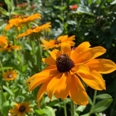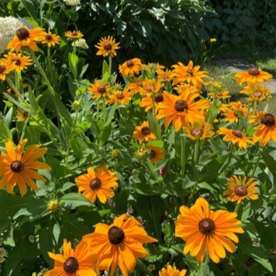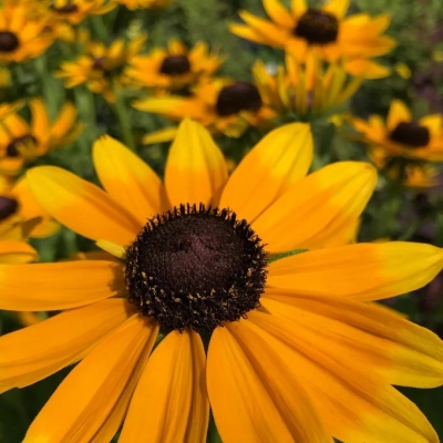 Соцветия рудбекии представлены корзинками, размер цветков достигает 10 см. Цветы язычковые, окрашены в солнечно-желтый цвет. Сердцевина цветка выпуклая и темная, черного цвета.