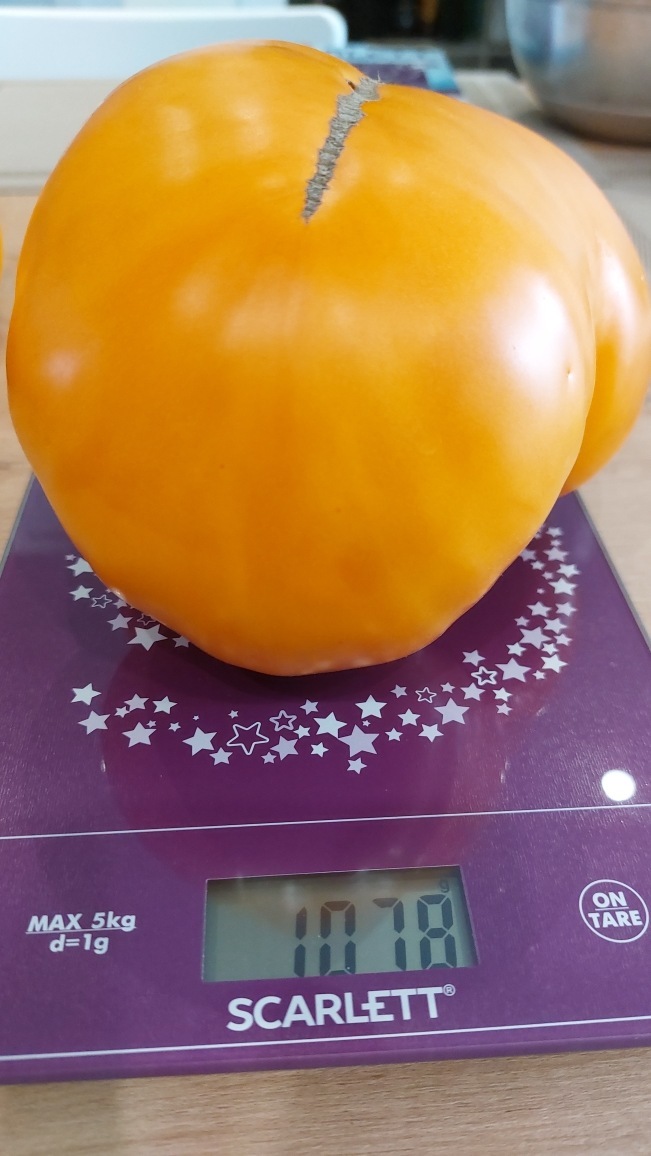 Как и плоды других сортов, незрелые помидоры остаются зелеными. Зеленое пятно у плодоножки отсутствует. По мере созревания они приобретают яркий желтый, оранжевый цвет. Насыщенный окрас придает урожая высокую товарность. Вес варьируется от 400 до 600 граммов. Размеры – крупные, при соблюдении всех правил агротехники. Форма – округлая и немного приплюснутая, с большим количество ярко выраженных ребер. Мякоть в меру плотная, сочная и мясистая. Ее цвет такой же, как и у кожицы.