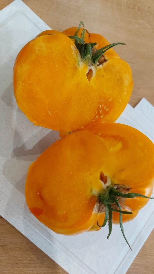 Томаты Амана Оранж тонкокорые, поверхность глянцевая и гладкая. Внутри большое количество семенных камер, но с небольшим содержание семян.