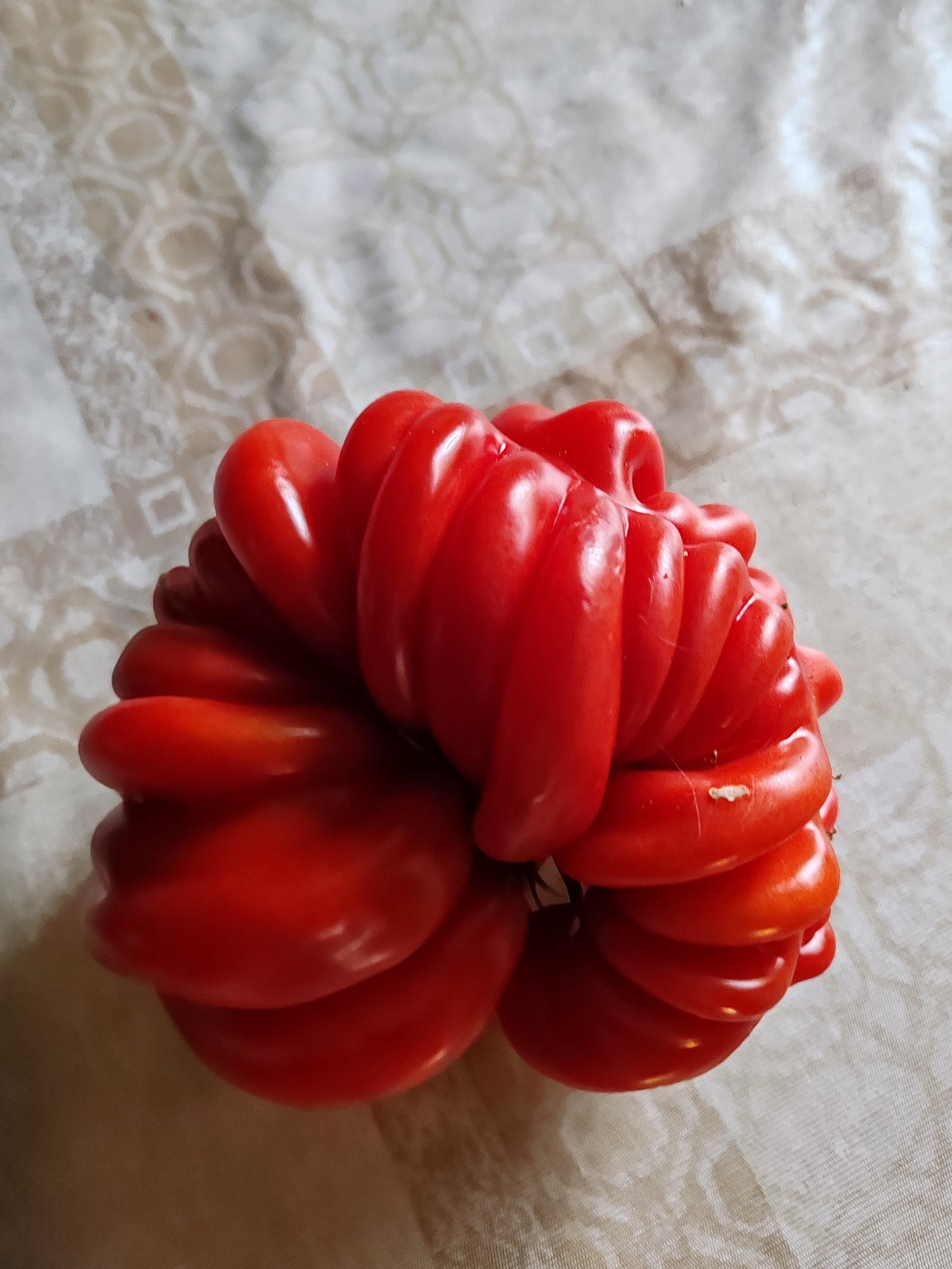 Вес одного плода доходит до 400 г. К вершине побега плоды слегка мельчают, что идеально для закатывания и консервации продукта. Лежкость у томатов высокая, что позволяет долго их хранить.