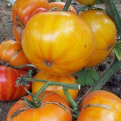 Плоды томата Большой оранжевый полосатый имеют характерную плоскоокруглую форму и могут достигать массы до 500 граммов. Их внешний вид привлекает внимание благодаря яркому оранжевому цвету с желтыми полосками, что делает их не только вкусными, но и эстетически привлекательными. Такой окрас плодов является отличительной чертой сорта и добавляет разнообразия на столе.