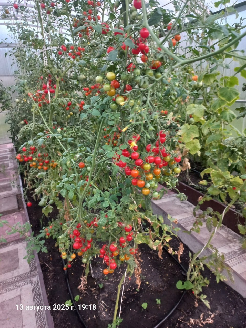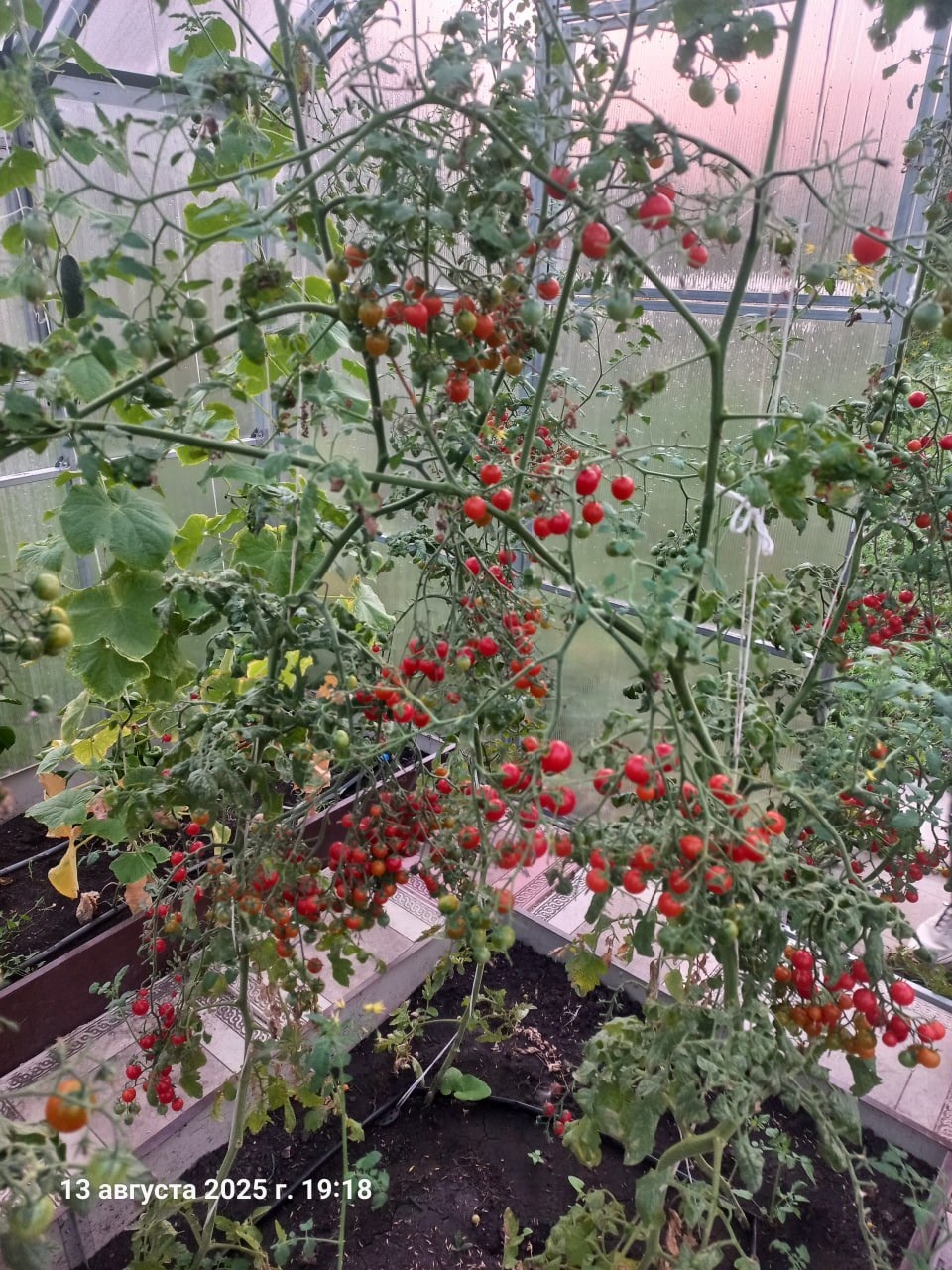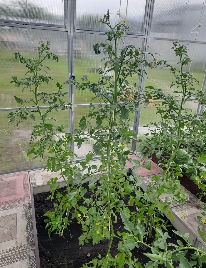 16.03.2025 посадила в грунт проклюнувшиеся (6 из 7). В теплицу высадили 3.05.2025. Пока особо сказать нечего, хочу показать, как выглядят помидорки на текущий момент) Красивые грозди, очень нравятся. И их много. Надеюсь на отличную урожайность и вкус. Сами томаты самые высокие из тех, что растут в теплице.